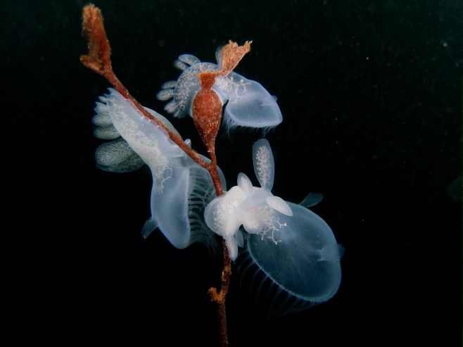 Hooded Nudibranchs (up to 17.5 cm) on Giant Kelp.