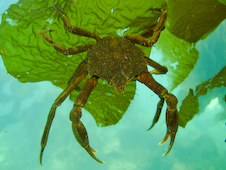 Typical shape of members of the kelp crab family. Species in this family are usually from 5 to 9 cm across the carapace.