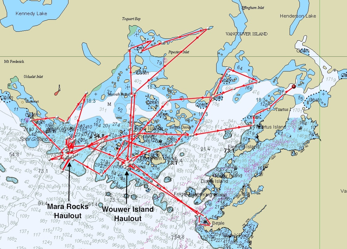 See the image below – Kaouk has been exploring Barkley Sound and hauling out on a regular basis over the last 10 days, first at Mara Rocks (the largest and only year-round Steller haulout in Barkley Sound – see previous update) and more recently at Wouwer Island (a winter haulout occupied by Steller and California sea lions mainly outside of the May-August breeding season). He has been frequenting areas knowing to be good herring spawn areas, and areas known to have concentrations of sardines). Go Kaouk go – eat lots! Scientist Peter Olesiuk of DFO reports that he needs to eat 15-20 kg per day, which is apparently a challenge. Scientist Peter Olesiuk of DFO reports that about 46% of sea lions don’t make it through their first year.