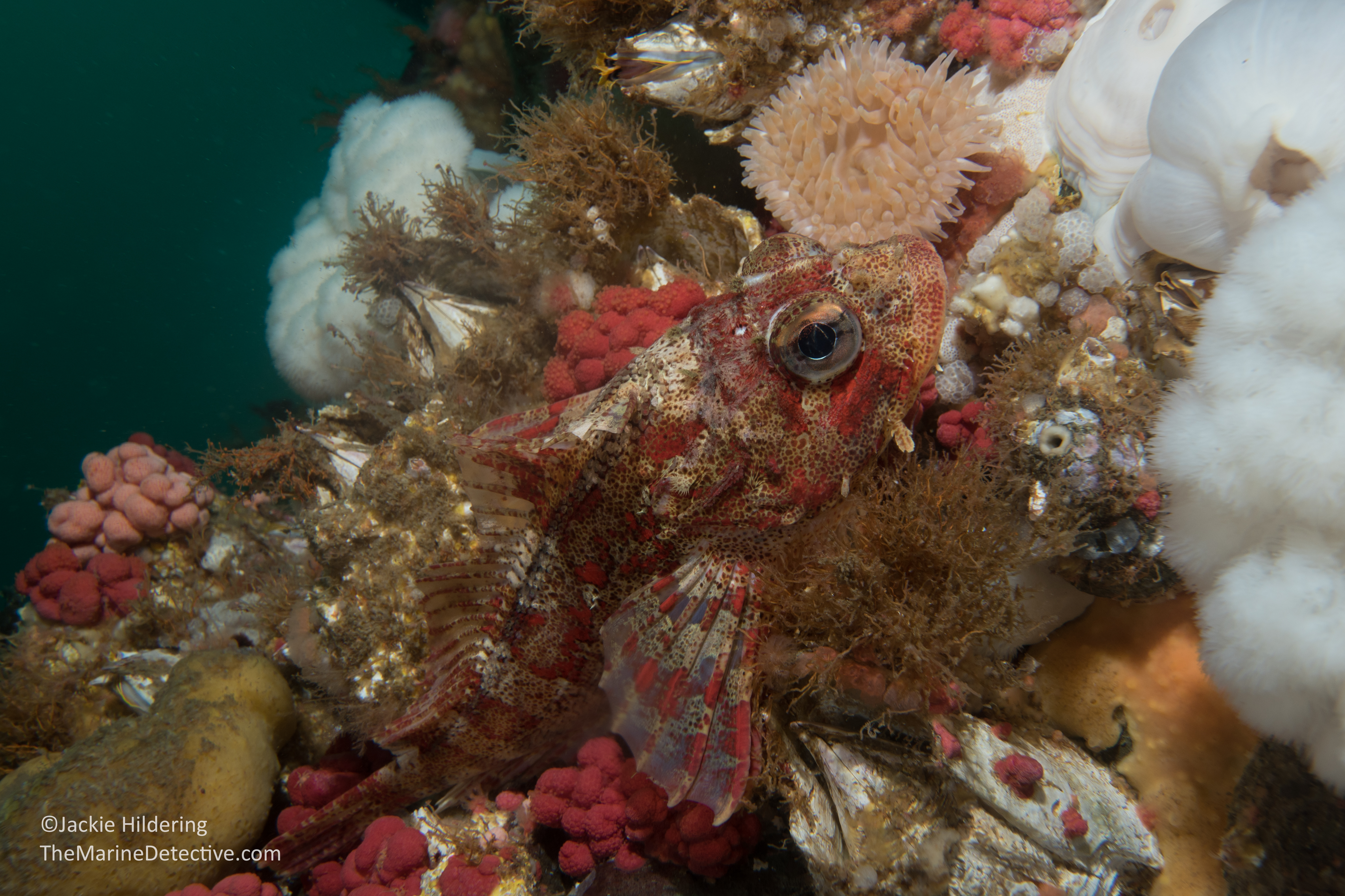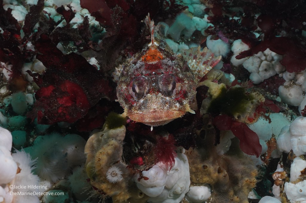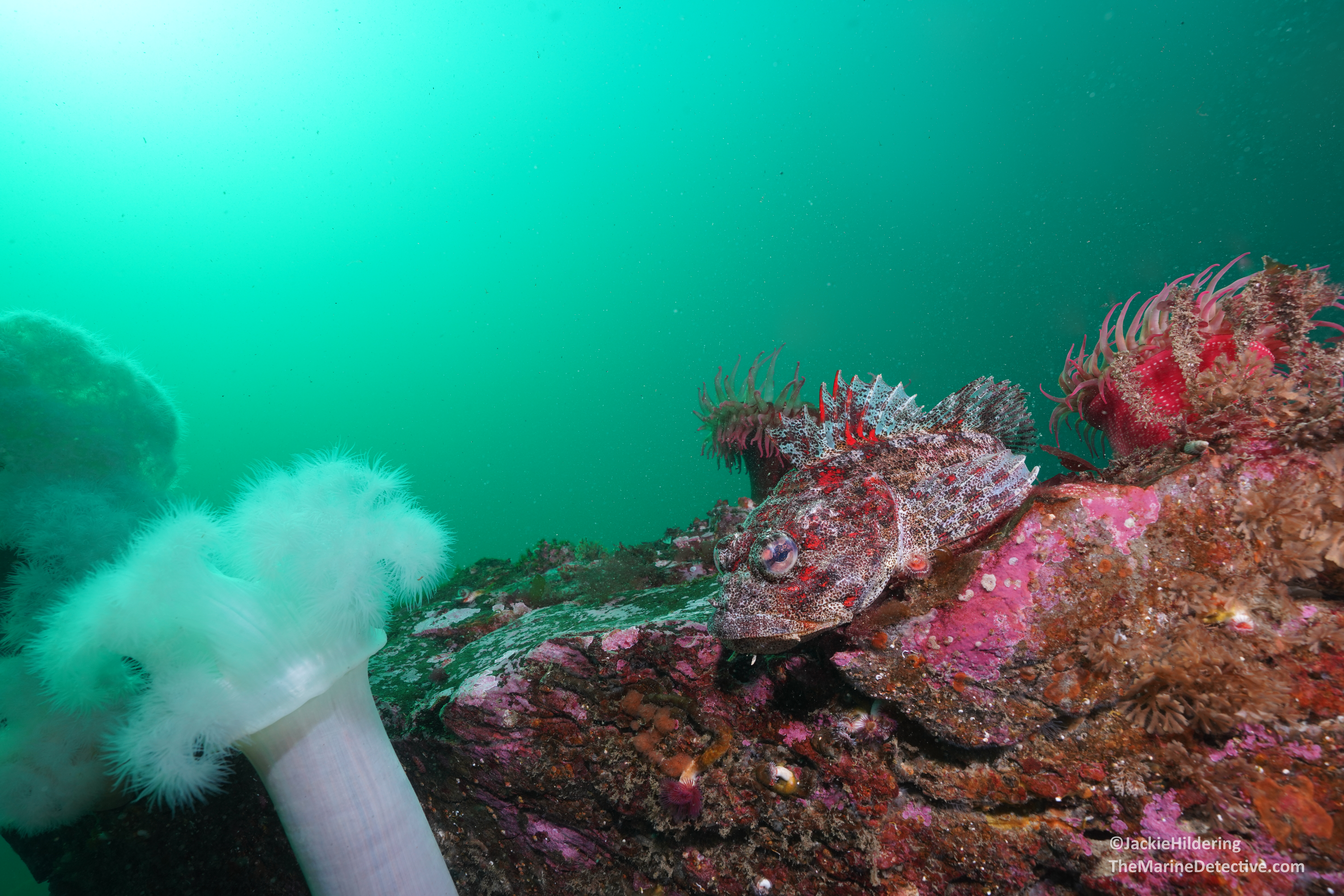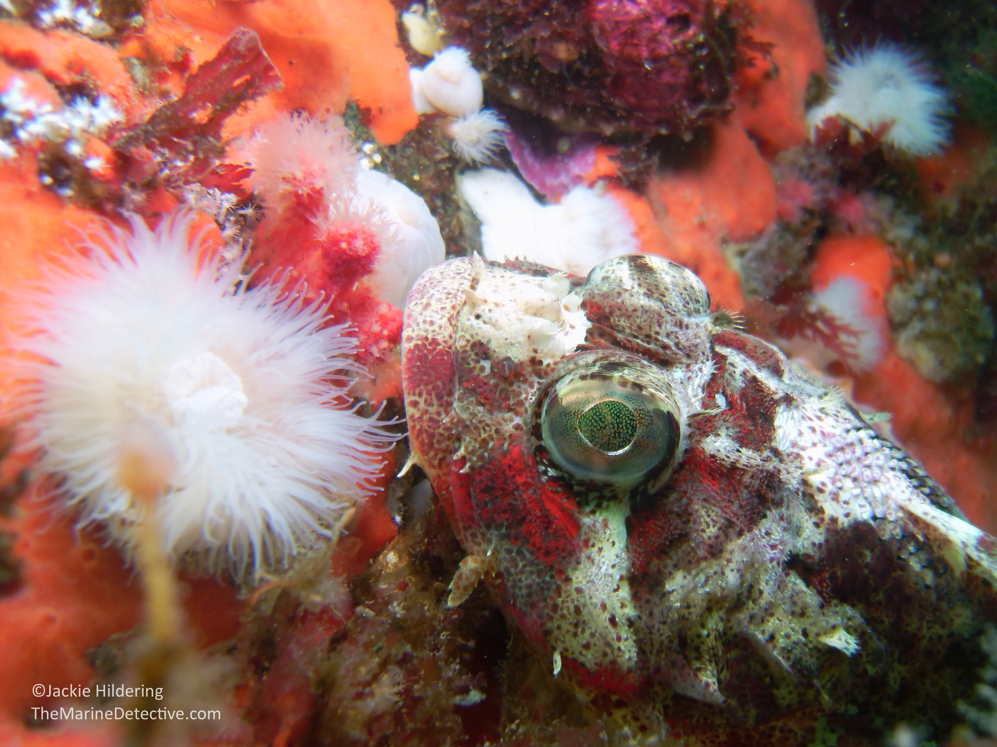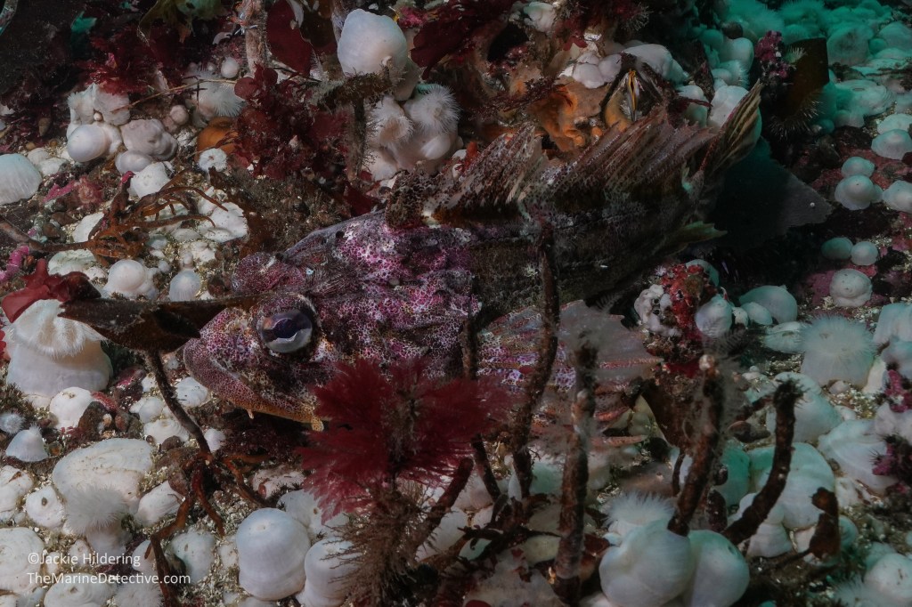 The Red Irish Lord (Hemilepidotus hemilepidotus; up to 51 cm) is a fish of incredibly stunning diversity of colour. Right down to its flecked, bulging eyes, this ambush predator is a master of camouflage.