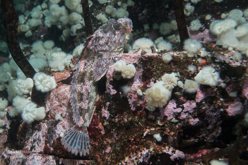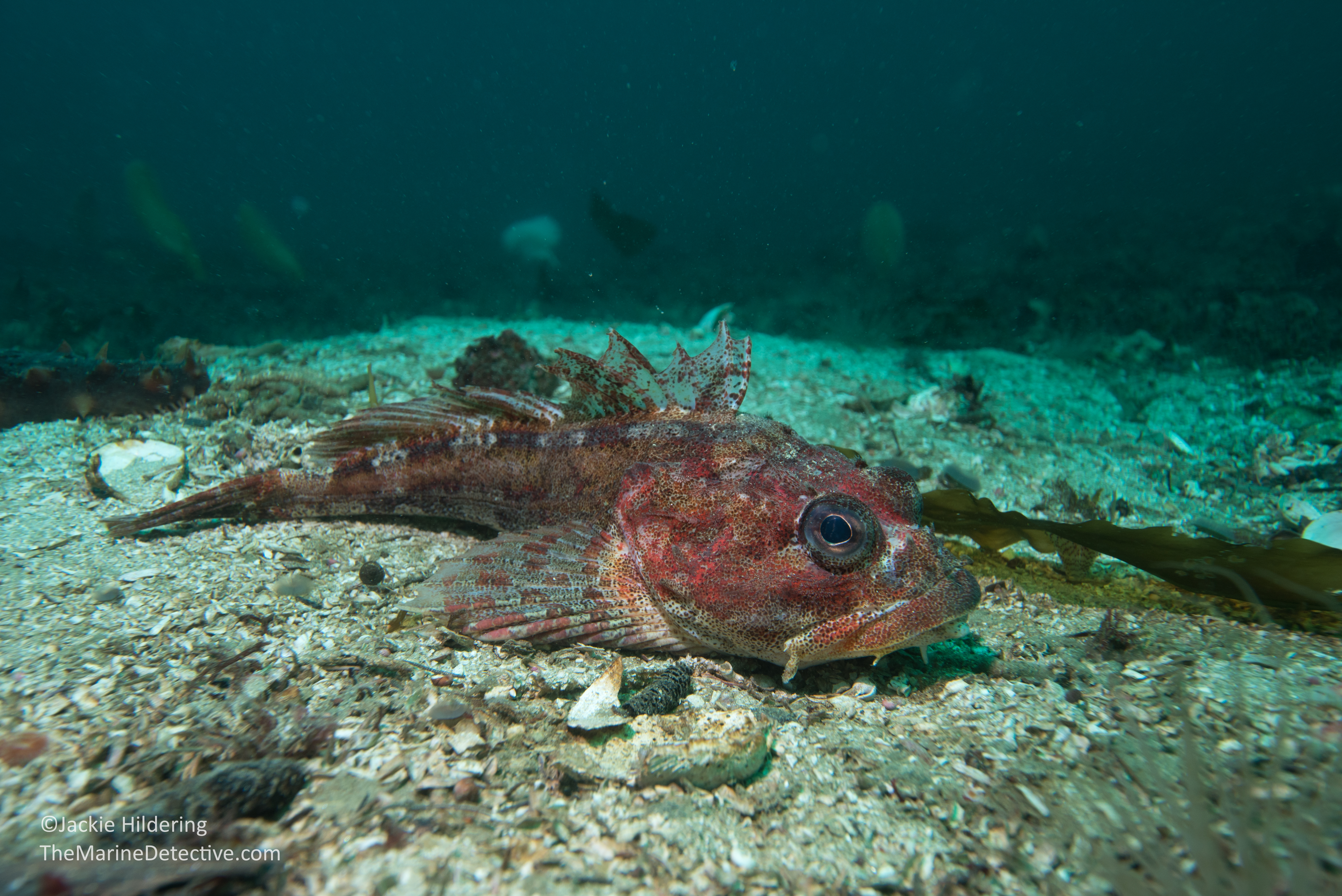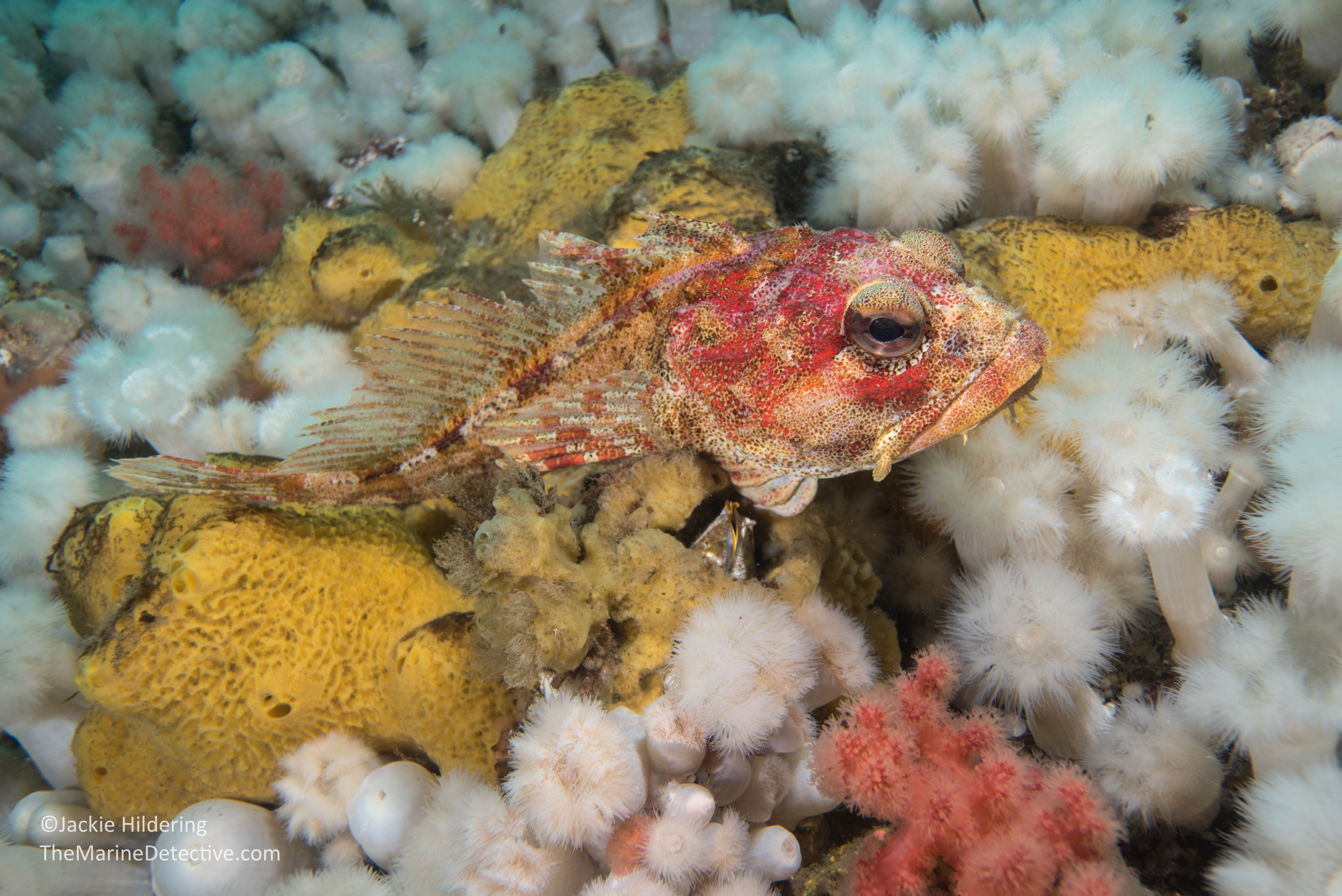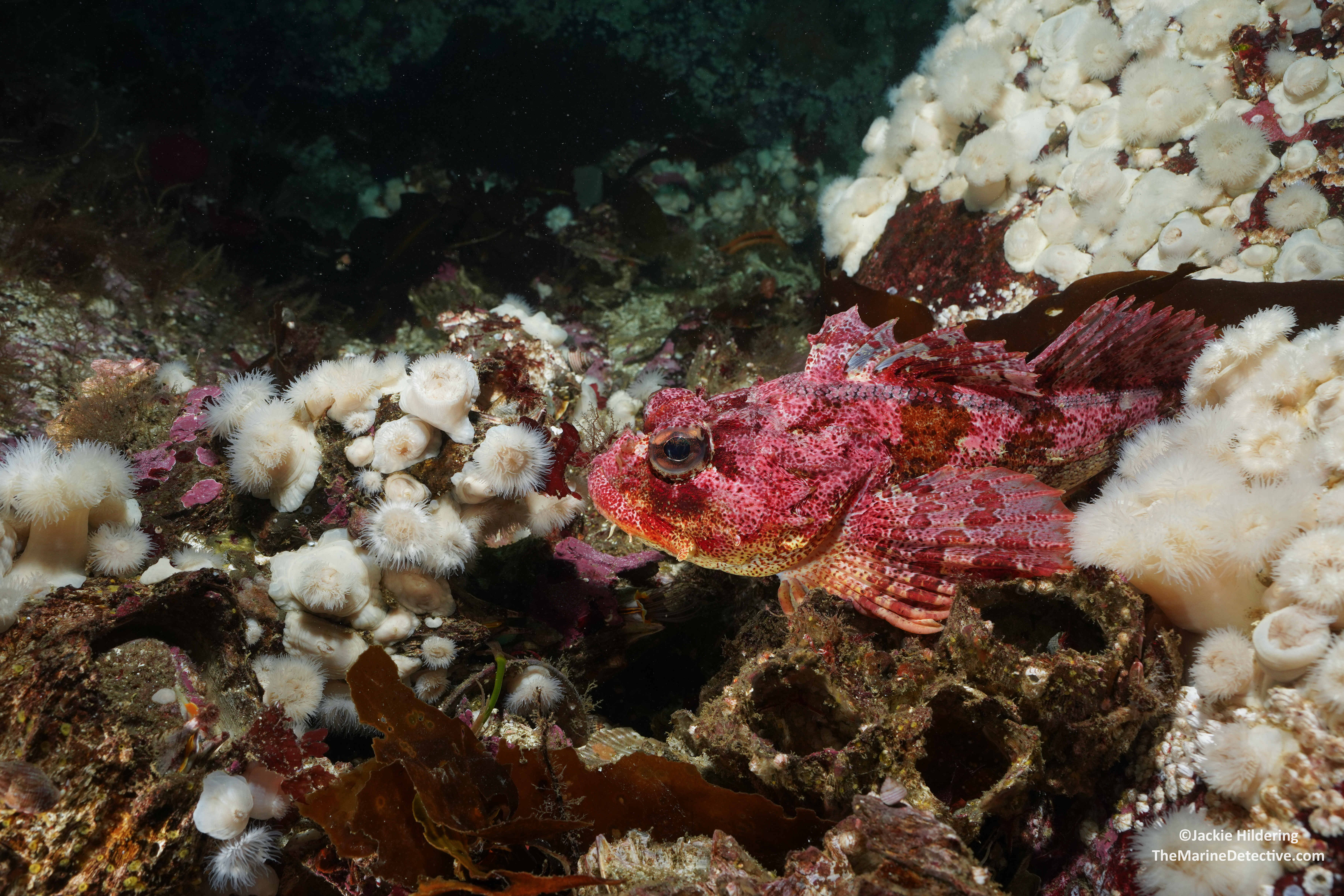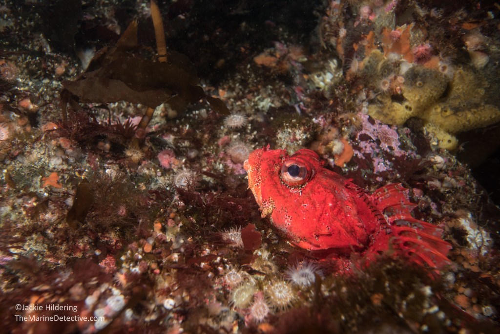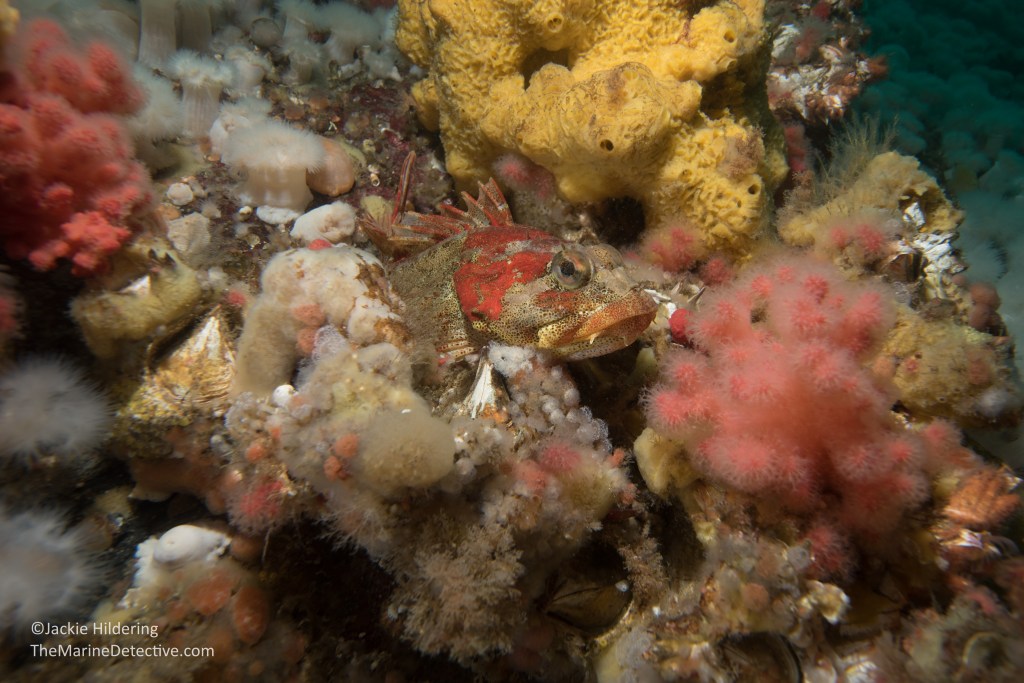 The Red Irish Lord (Hemilepidotus hemilepidotus; up to 51 cm) is a fish of incredibly stunning diversity of colour. Right down to its flecked, bulging eyes, this ambush predator is a master of camouflage.