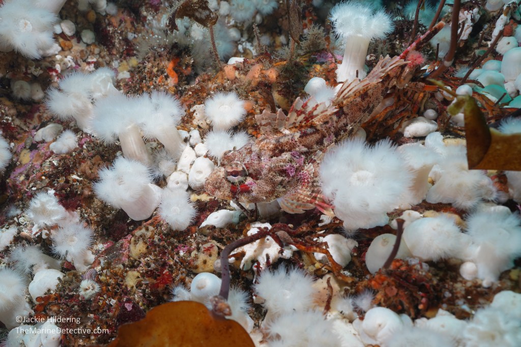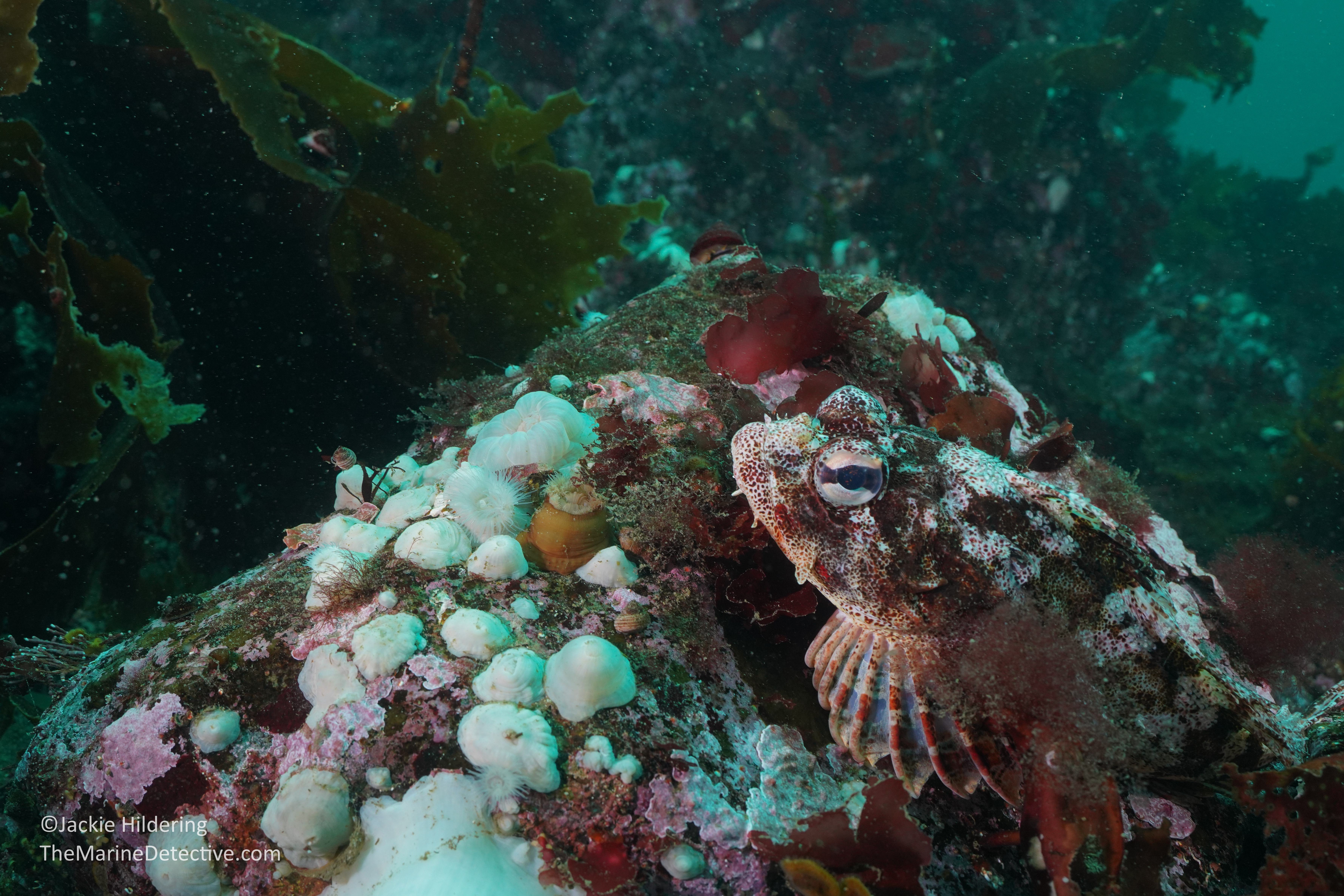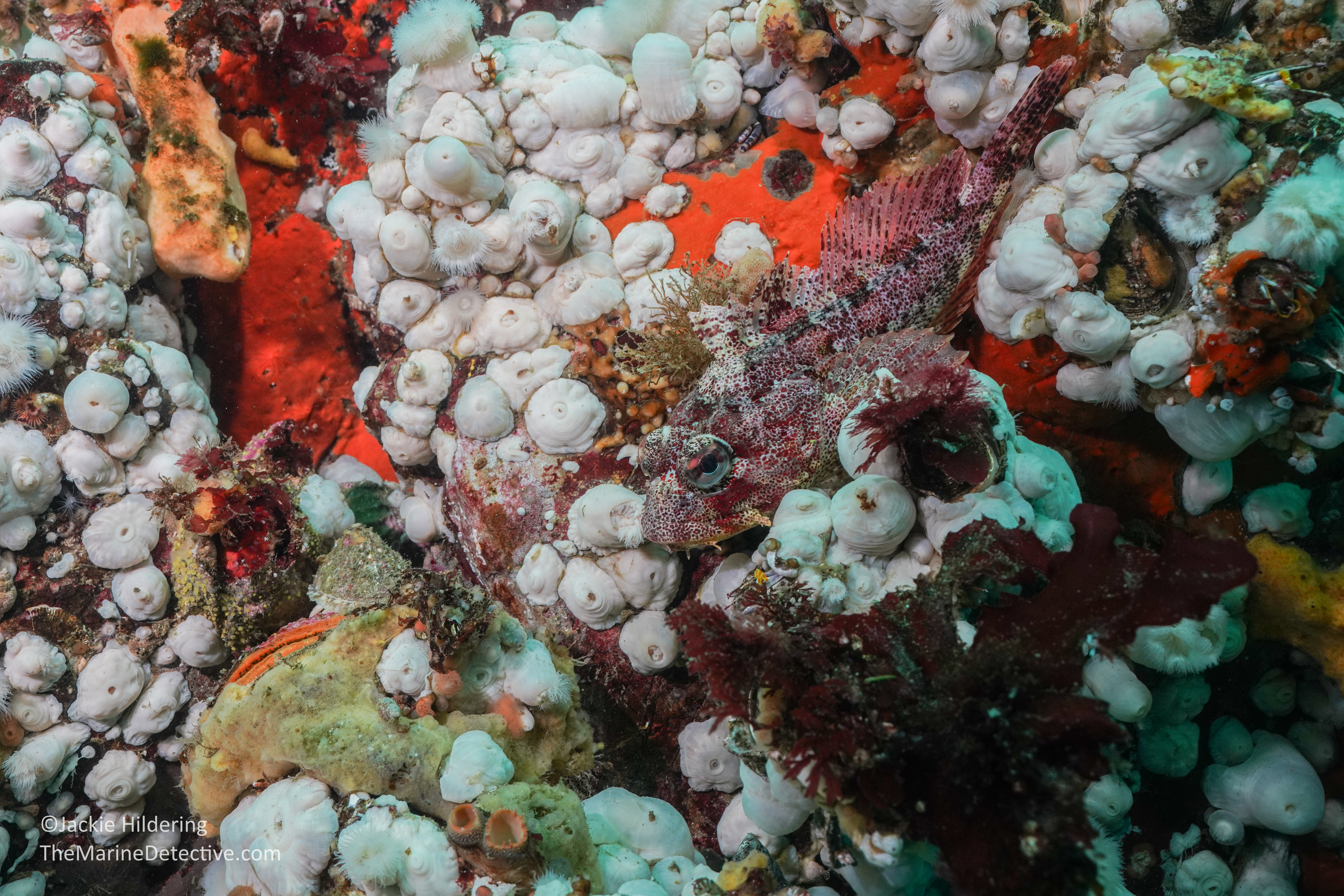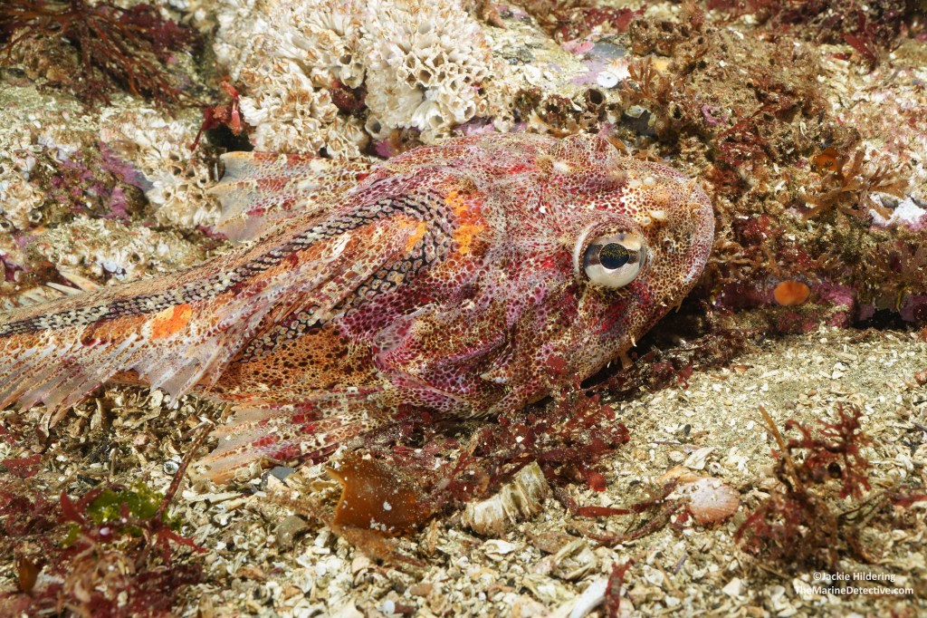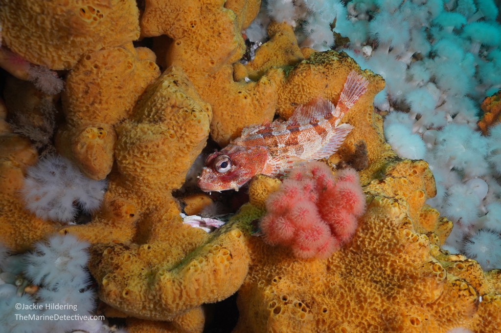 The Red Irish Lord (Hemilepidotus hemilepidotus; up to 51 cm) is a fish of incredibly stunning diversity of colour. Right down to its flecked, bulging eyes, this ambush predator is a master of camouflage.
