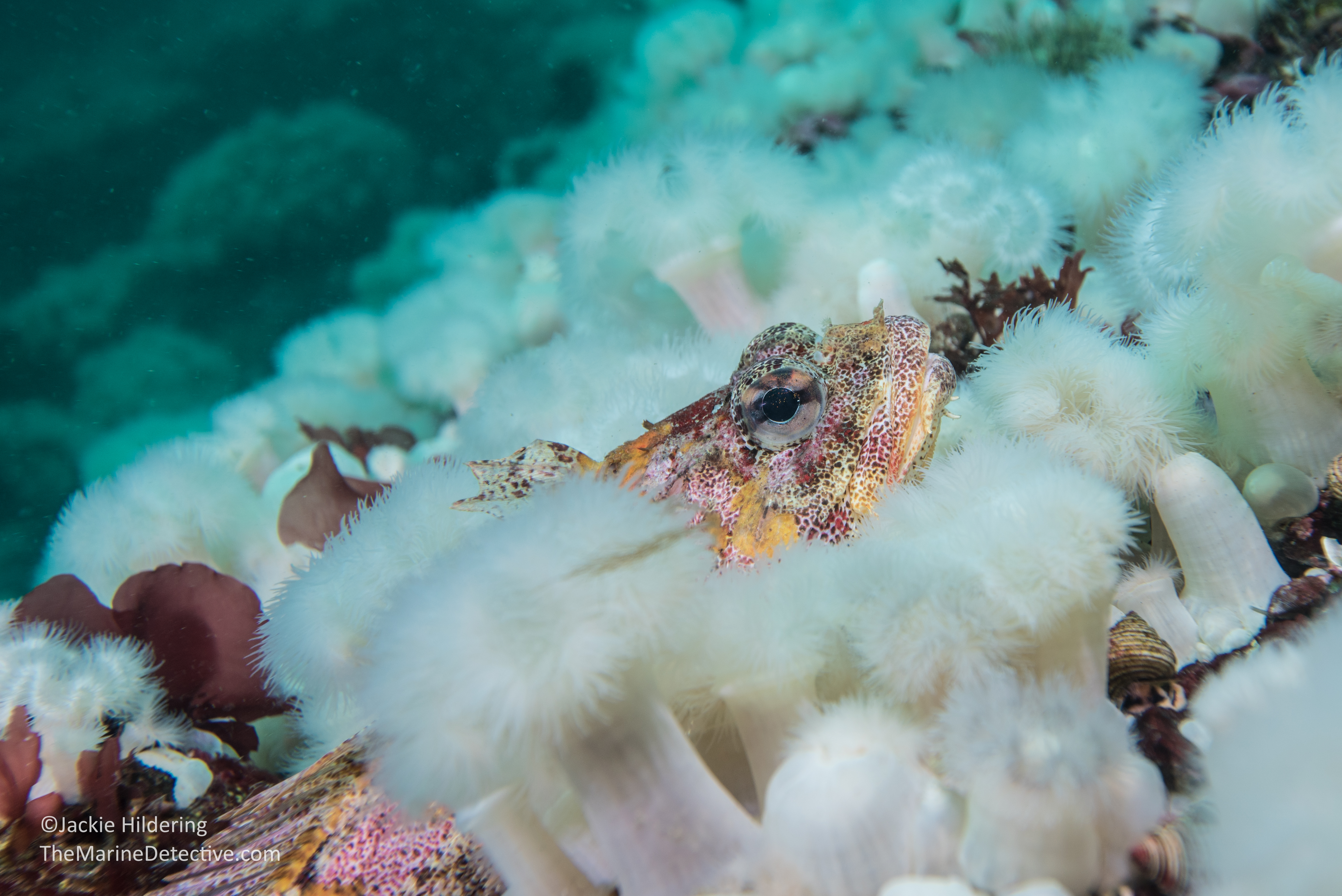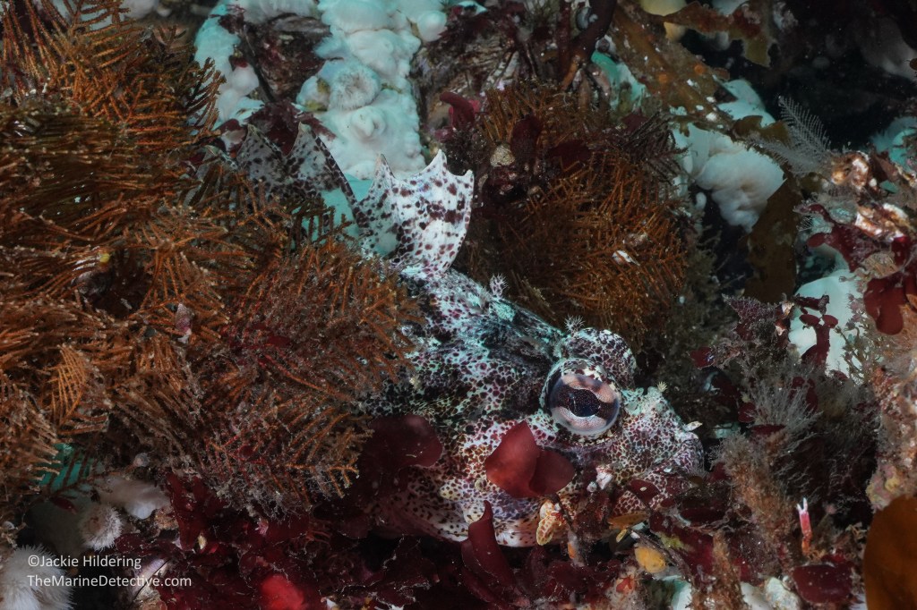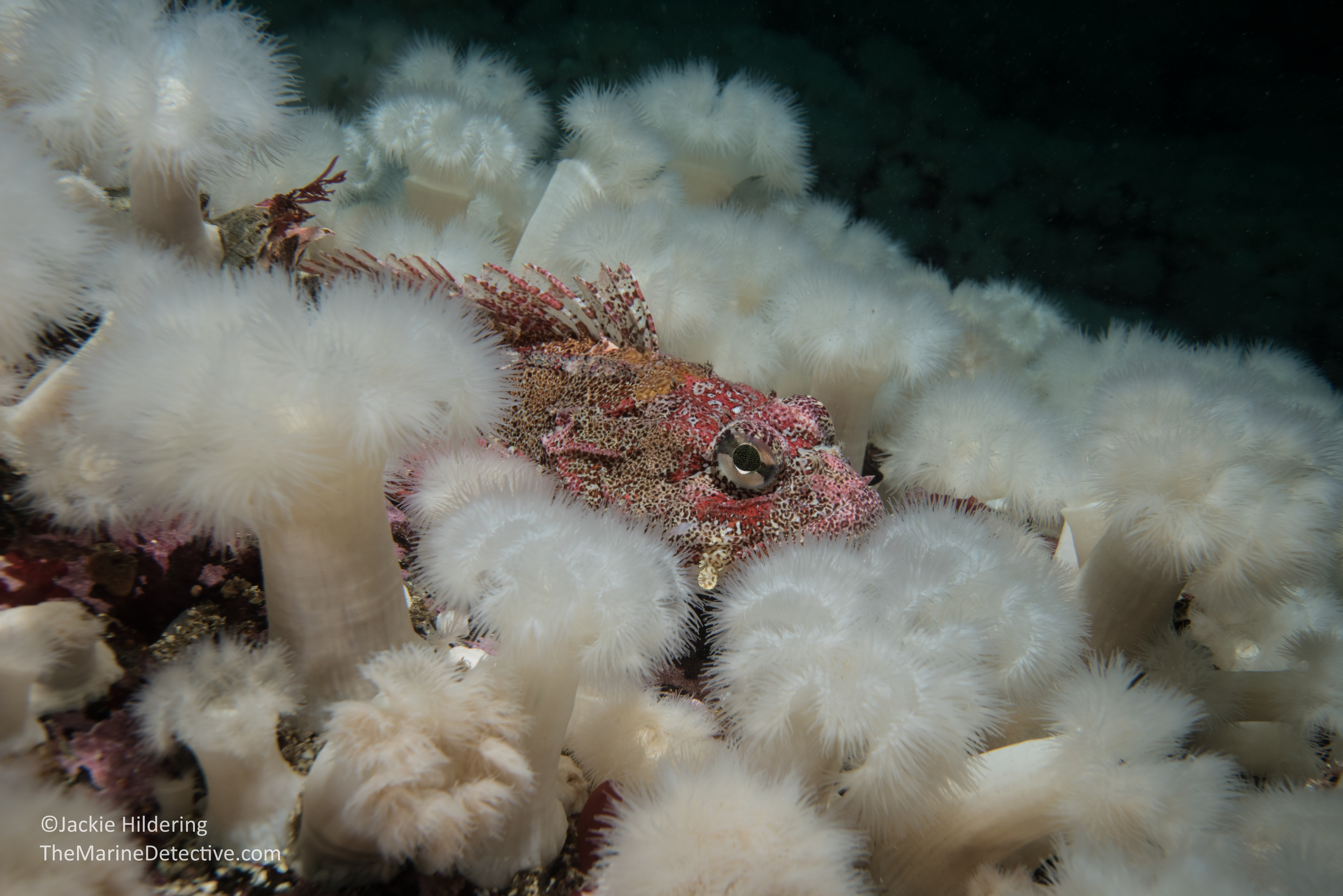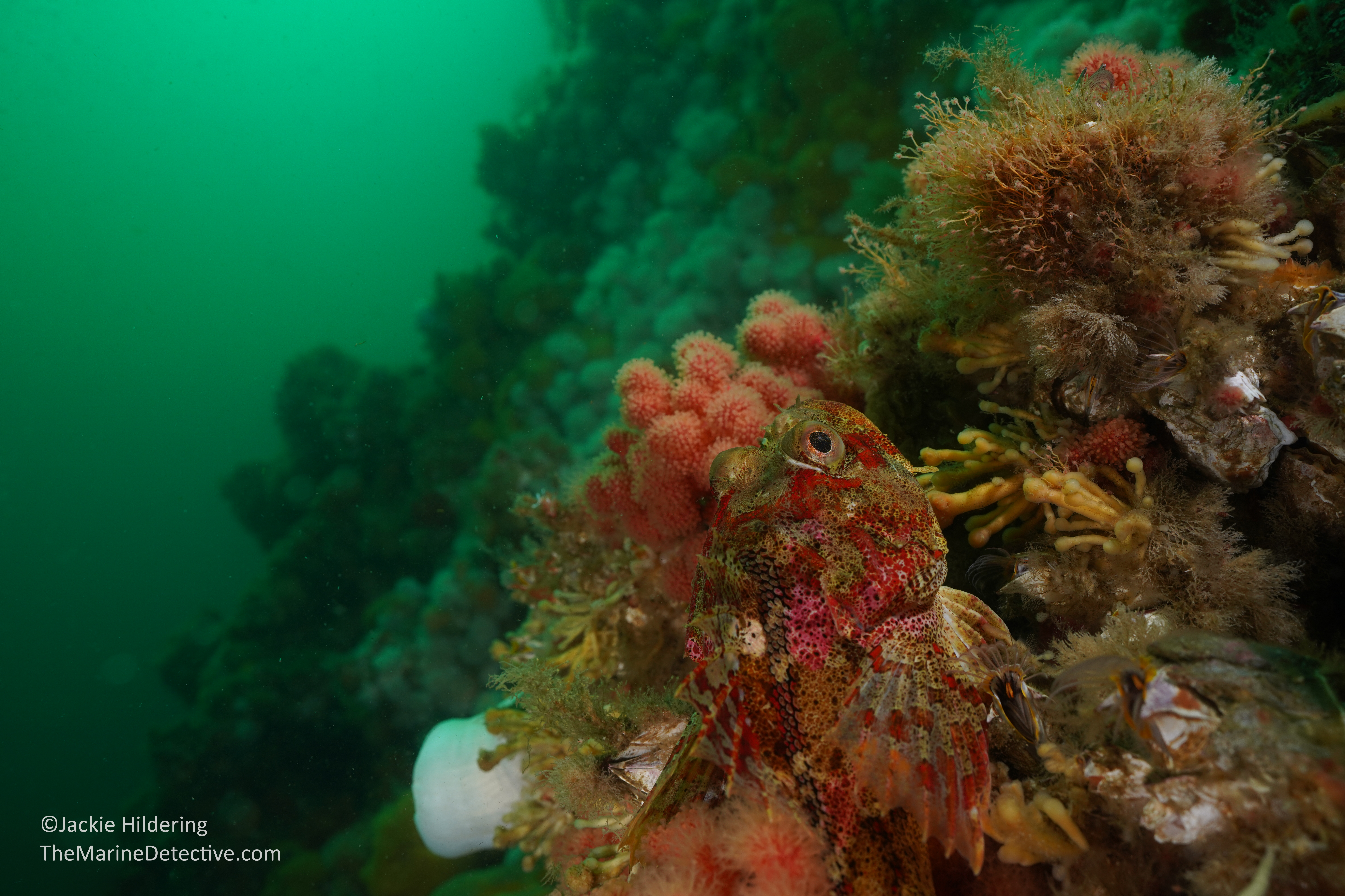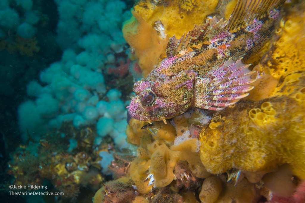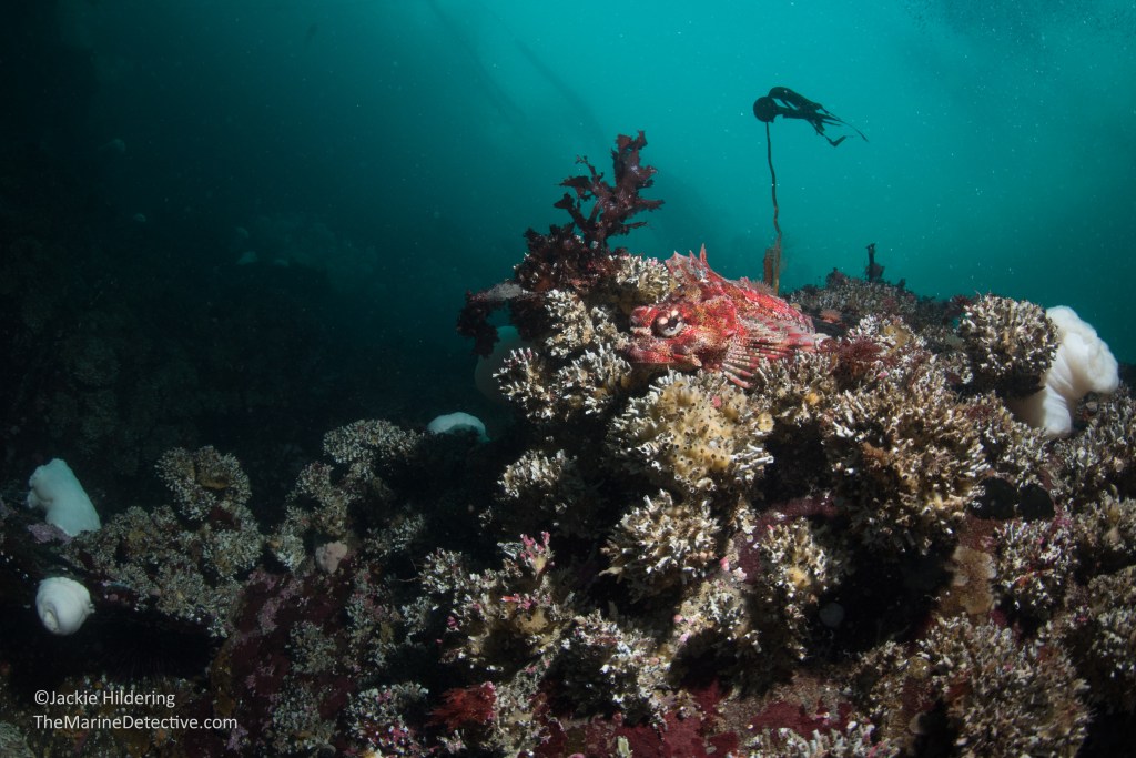 The Red Irish Lord (Hemilepidotus hemilepidotus; up to 51 cm) is a fish of incredibly stunning diversity of colour. Right down to its flecked, bulging eyes, this ambush predator is a master of camouflage.