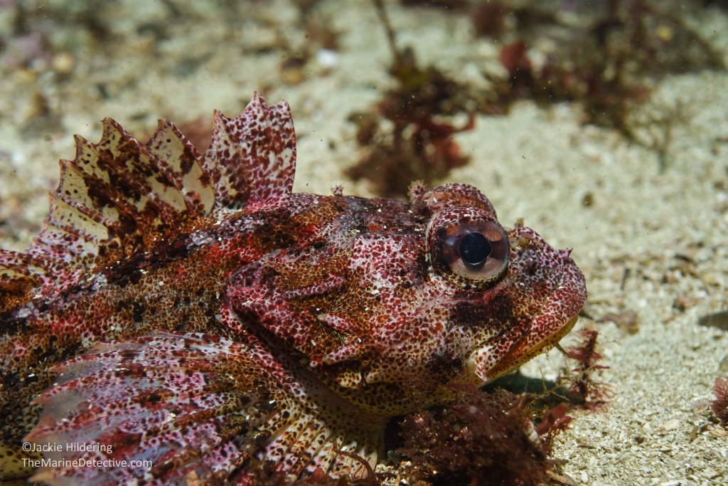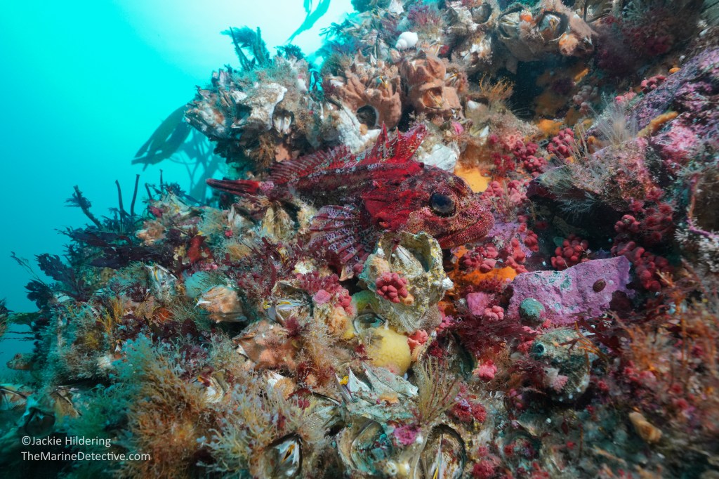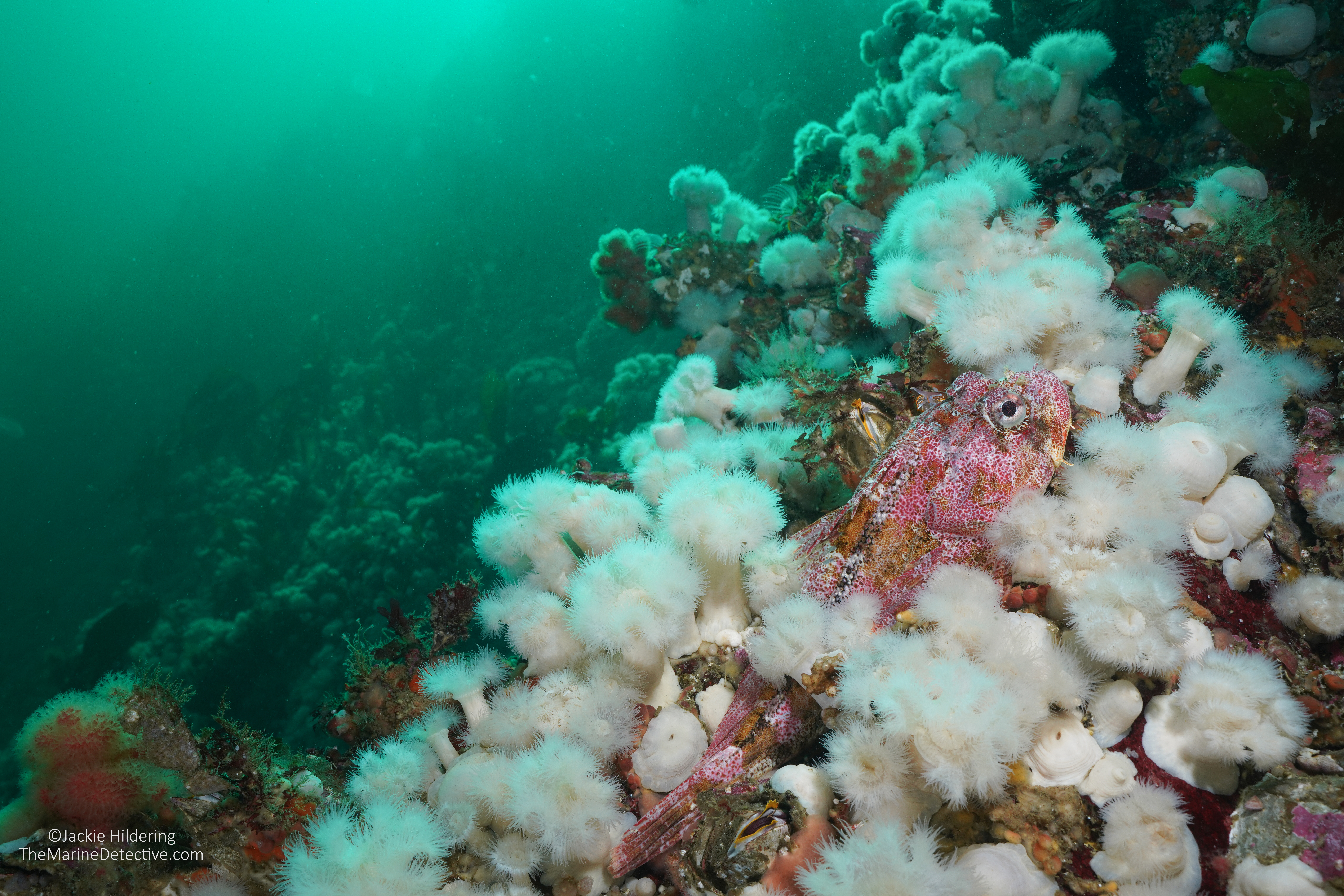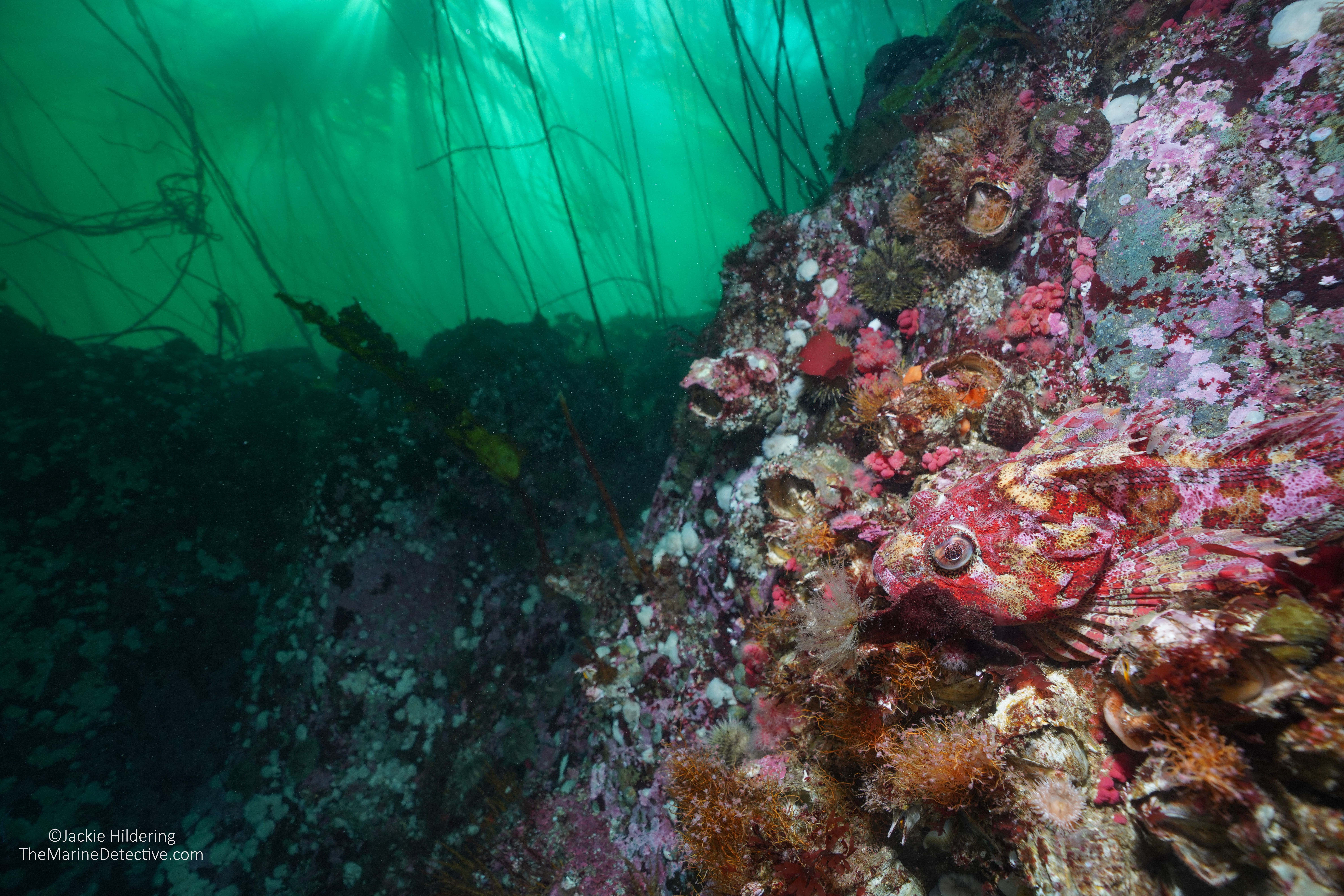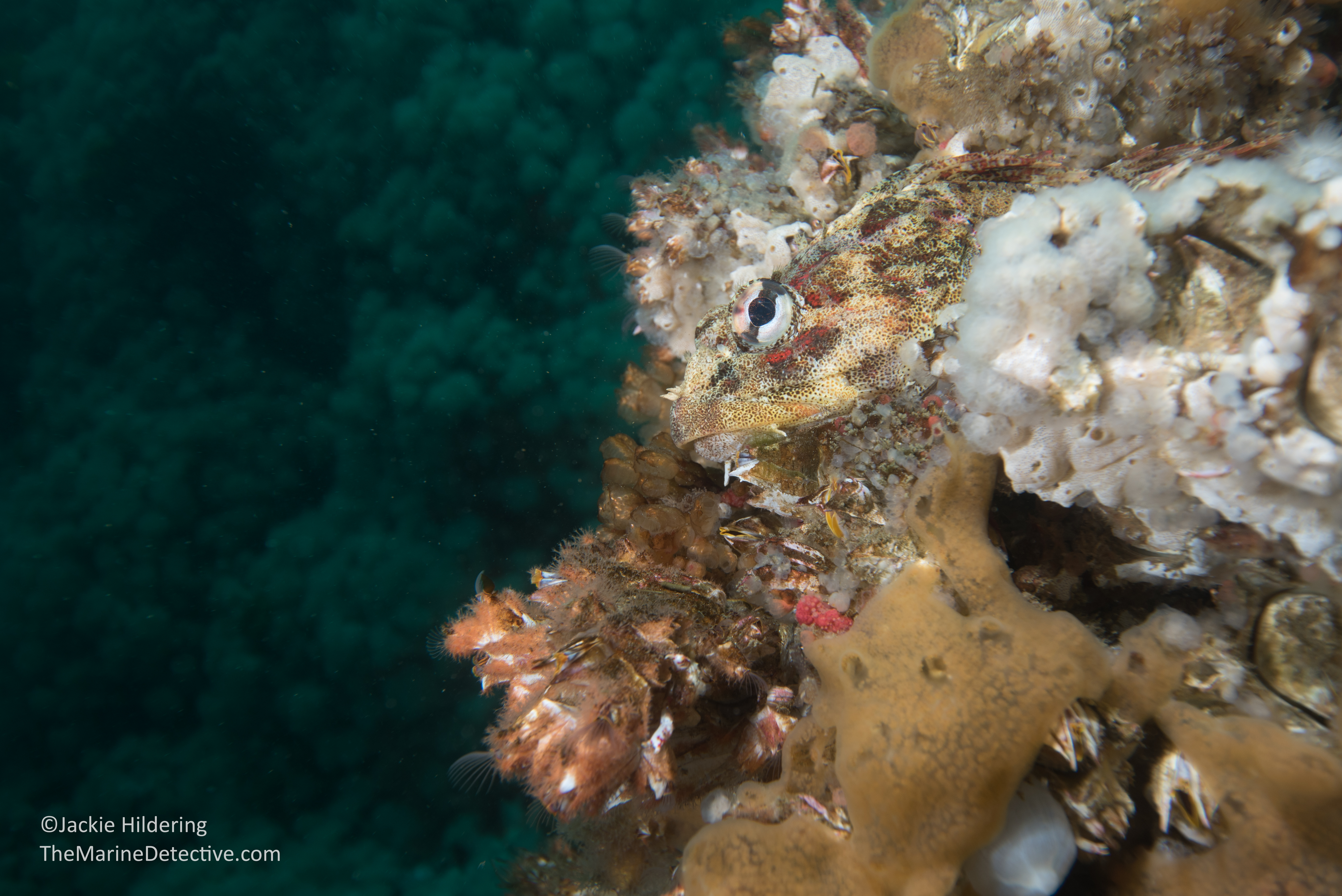 The Red Irish Lord (Hemilepidotus hemilepidotus; up to 51 cm) is a fish of incredibly stunning diversity of colour. Right down to its flecked, bulging eyes, this ambush predator is a master of camouflage.