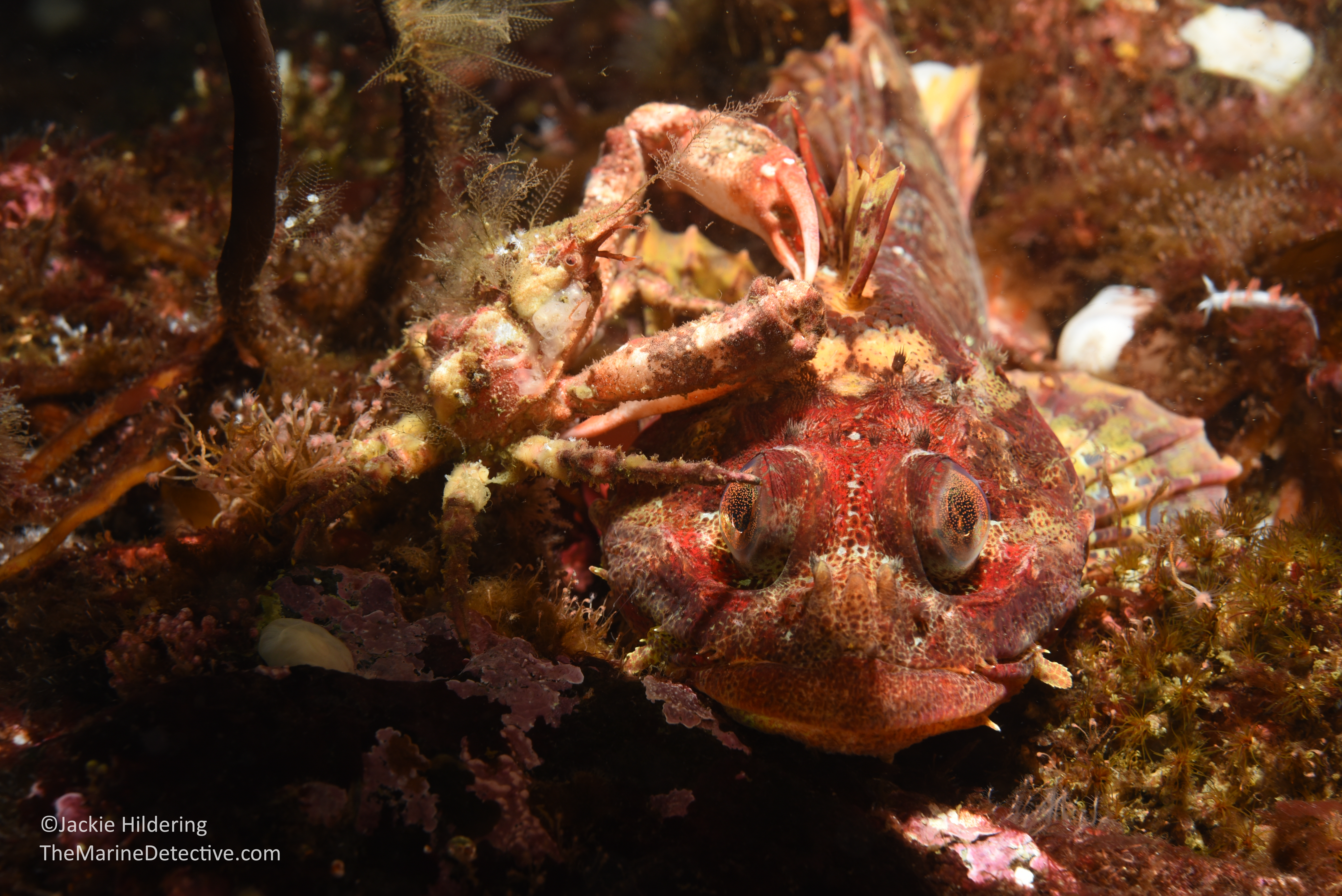 A Red Irish Lord who is hoping the Sharpnose Crab inches down just a bit further so that s/he can feed (and that the annoying photographer would go away!). See my blog “Crabs Making Bad Choices” for more photos of such interactions at this link.