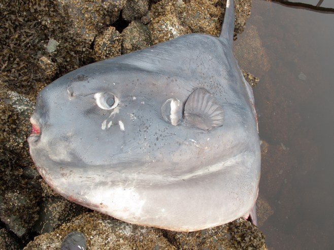 Something very unexpected landed near the Port Hardy seaplane base on October 20th, 2011 – a dead Mola tecta. This species of ocean sunfish looks like a cartoon character rather than a relatively fast-moving, deep-diving fish whose design has been perfected by millions of years of evolution.