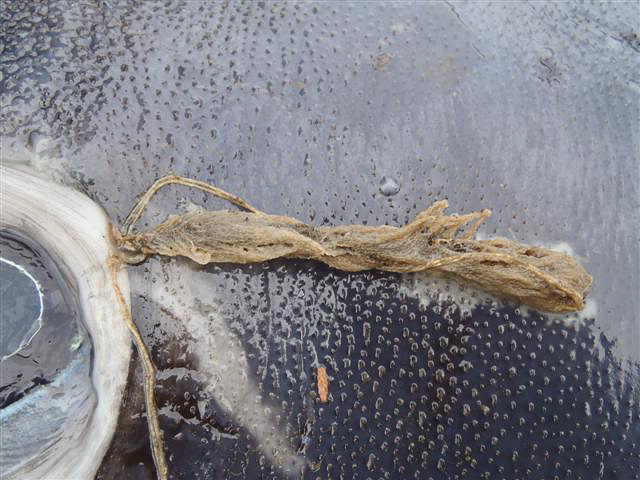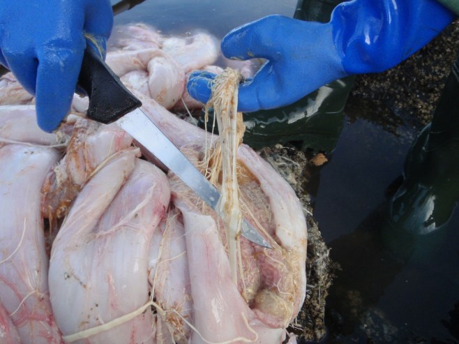 Her intestines were an astounding mass of worms. Likely the species include the parasitic flatworm, Nematobibothrioides histoidii which is thread-like but can grow to be over 12 m (40′). No one apparently knows just how long they can become, in part because dissections/necropsies on Mola mola are rare events. Photo credit: Natasha Dickinson.