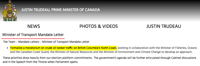 Click to enlarge. Content from PM Trudeau’s November 2015 mandate letter to the Minister of Transport confirming the priority of the moratorium. The mandate letter can be found here.