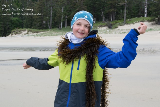 The happiness that comes with connection to nature and making discoveries – Kay with a boa of “Feather Boa Kelp” that had washed onto the beach. Be on the lookout for Salmon Tellins on a fine sand beach from Alaska to California. Note that other mollusc species (and worms, some sea slugs, etc) also leave tracks in the sand. More on other trail-blazing species in the future.
