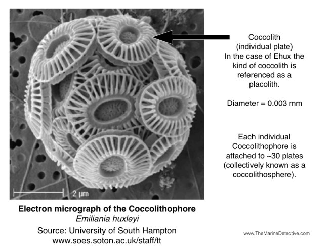 Coccolithophores are a group of plant-like plankton (phytoplankton). Coccolithophores are single-celled and have been around for some 220 million years (give or take a million) and there are now more than 300 species. This bloom is likely due to the Emiliania huxleyi, abbreviated as “Ehux” (like the way Tyrannosaurus rex is known as Trex).