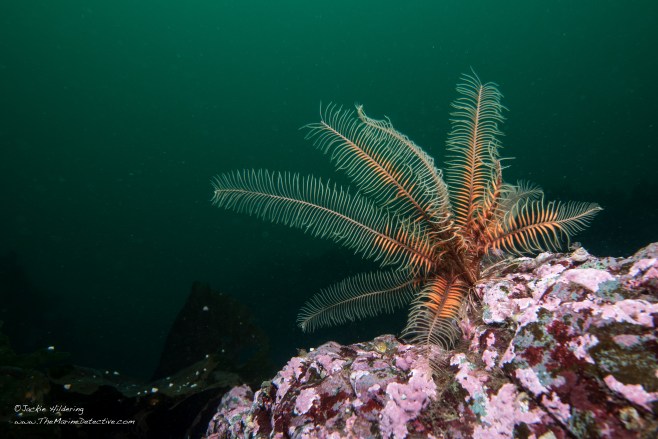 There are many feather star species in the world but the detail here is about the species commonly found in shallow water off the coast of British Columbia – Florometra serratissima (range is from the Aleutian Islands to Baja California).