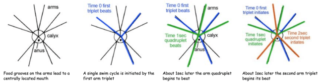 “Florometra serratissima is the only swimming species of crinoid on the west coast of North America. It swims by graceful undulation of its arms in 3 sets, each set moving successively but overlapping. Thus, while about one-third of the arms are in power stroke, another third are in recovery, and the last third somewhere in between. During the power stroke the arms extend out maximally for greatest frictional resistance, while during the recovery stroke they bend inwards to minimise resistance.”