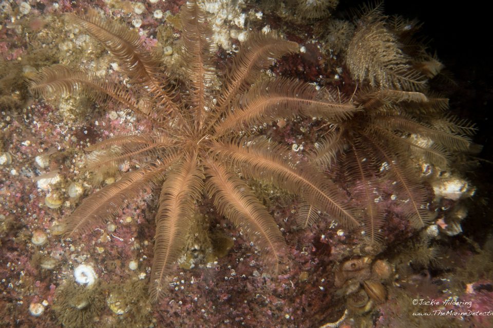 There are many feather star species in the world but the detail here is about the species commonly found in shallow water off the coast of British Columbia – Florometra serratissima (range is from the Aleutian Islands to Baja California).