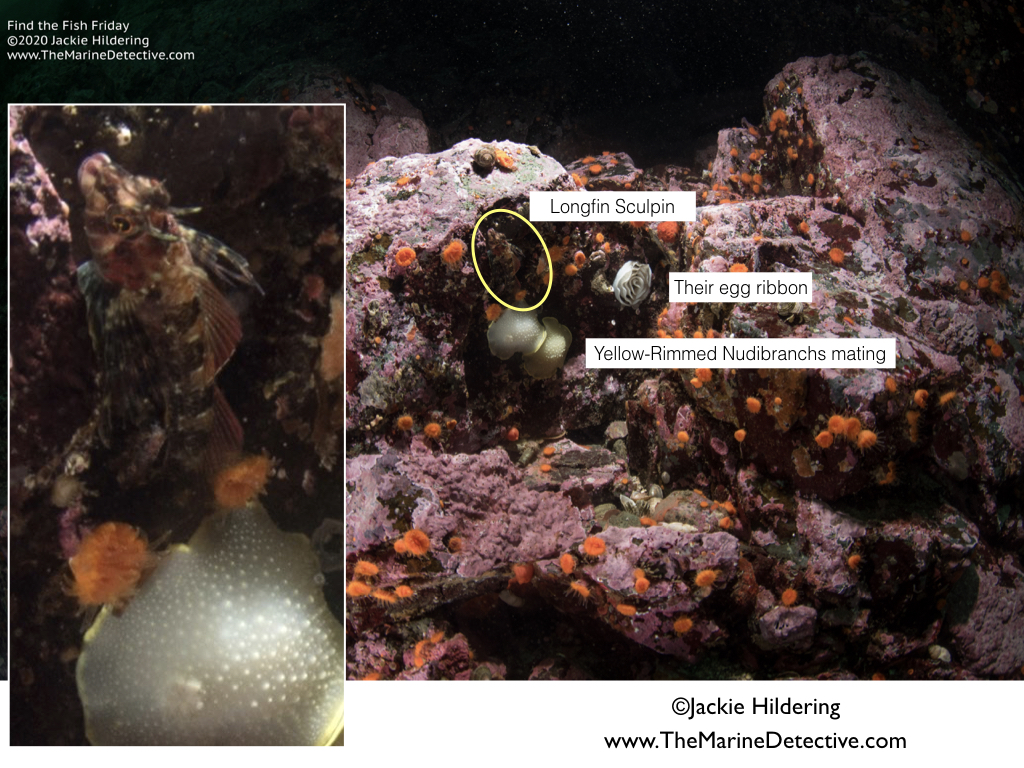 Longfin Sculpins look very different at night. They are among the local fish species that darken to match their night surroundings. This is called “nocturnal colouration”. You can see how very different Longfin Sculpin’s night colour is by going to my blog here.