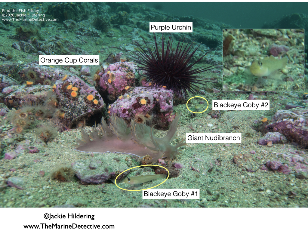 In the picture below. There are two Blackeye Gobies. One is easy to find but you will likely have to search quite hard to find the second one. As you search, notice the Giant Nudibranch. Yes, another GIANT. This kind of sea slug can be 30 centimetres long. They can swim and they are also amazing predators. I have lost of information about them in my blog at this link.