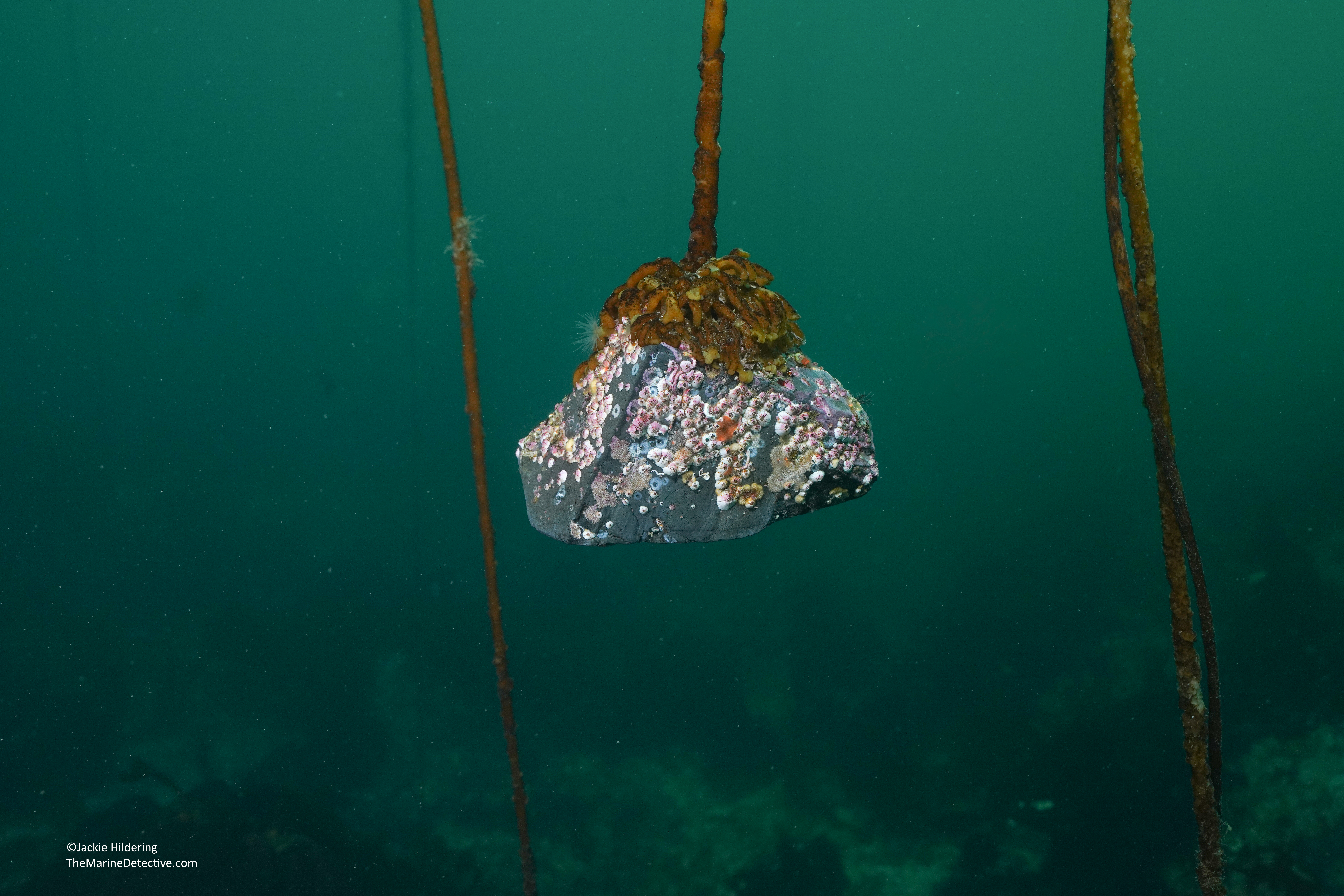 You can imagine how strong the holdfast has to be to withstand the buoyancy of the waves, current and the kelp’s floatation (the gas-filled pneumatocysts). The two photos below show how the buoyancy is greater than the mass of the rocks whereby the rock cannot anchor the kelp.