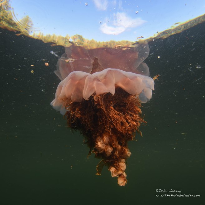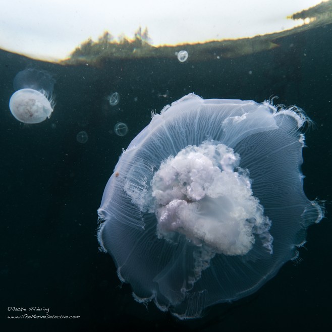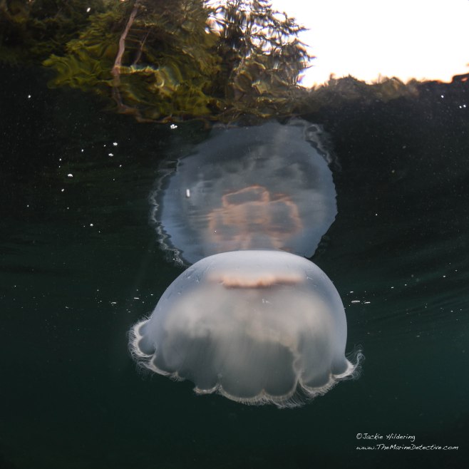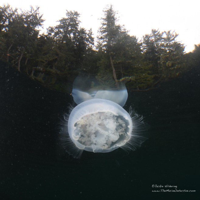 May these photos from my last dives north of Port Hardy offer you a bit of escape. I tried to capture trees in photos of jellies and the reflection of the jellies against the surface of the water. I hope the images communicate interconnectedness of land, sea and sky. May they also contribute to understanding and connection to our neighbours in the sea.