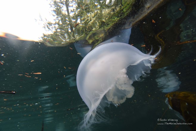 The last little while there have been hundreds, and hundreds, and hundreds of Moon Jellies = a “smack” of them. That truly is the collective noun for jellyfish.