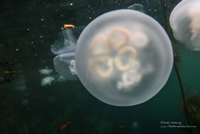 What brilliant photos Jackie!! I love your theme of interconnectedness springing from the smack of jellies. They are so beautiful! The gonads resemble a pretzel stuck inside. Are you saying moon jellies don’t sting? Love the widow rockfish story too, and what a photo of them in a feeding frenzy. I really admire and appreciate your work, thank you! One of these days plan to paint a large underwater scene along that ‘interconnectedness’ idea .. just haven’t figured it out yet.