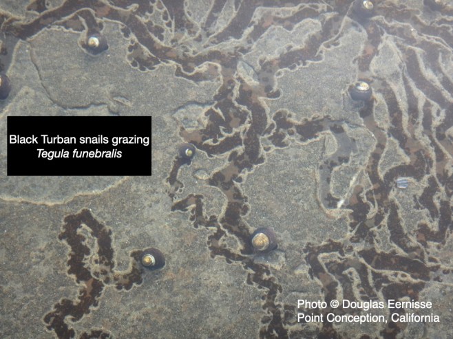 This led to input from Dr. Douglas Eernisse, professor of Biology at the University fo California, Santa Cruz.  He did not recognize the specific tracks in Stephen’s or Rick’s photos. He shared the image below showing OTHER radular tracks but with a big difference. His photo showed the marine snail species making the tracks. See the Black Turban snails having dinner? To give you an idea of scale, maximum size of Black Turbans is 4.5 cm.