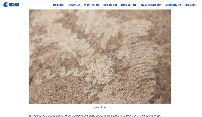1. The screen grabs below are from Dale Fort’s blog with the same image also being found on the website of the Field Studies Council in the United Kingdom for the Common Limpet (Patella vulgata). We do not have this species in British Columbia but the similarity in the pattern certainly supports that a species of limpet made the tracks in Stephens’ image.