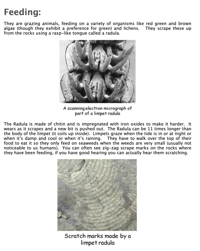 Extra:  A fascinating study from 2015 found that limpets (generally) are the “bulldozers of the seashore”. The study found that their “teeth” (radula) are made of the strongest biological material ever tested (and these teeth are less than a millimetre long)! The strength is the equivalent of one string of spaghetti holding up 1,500 kgs. From Professor Steven Hawkins, of the University of Southampton. “The reason limpet teeth are so hard is that when they’re feeding, they actually excavate rock. In fact, if you look at their faecal pellets they actually look like little concrete blocks – because by the time it’s gone through their gut it’s hardened.” (Barber et al).