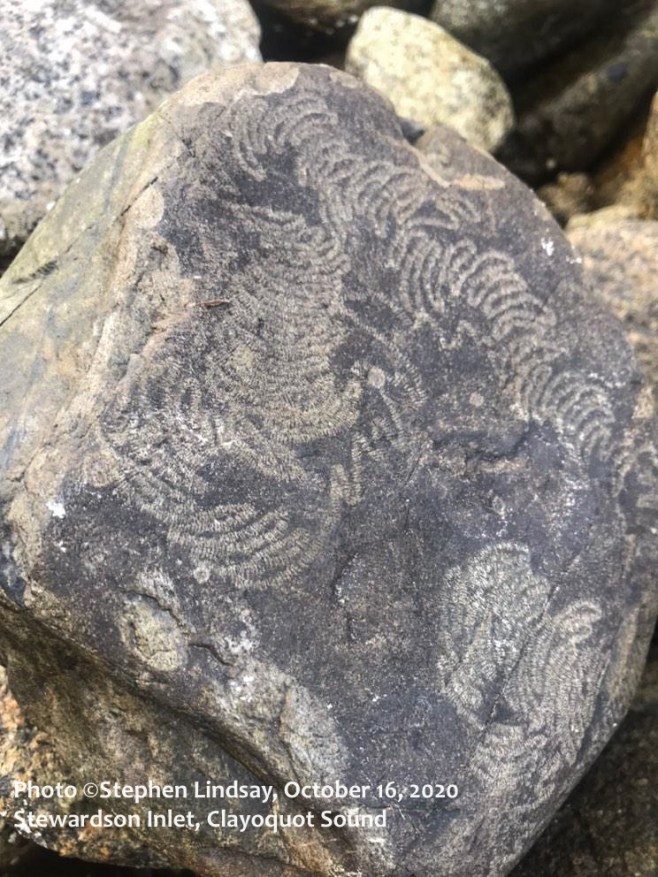It began with the photo shown below with an ID request by Marcie Callewart John and Stephen Lindsay. Stephen had taken the photo of the underside of this rock in Stewardson Inlet in Clayoquot Sound, SW Vancouver Island, British Columbia.