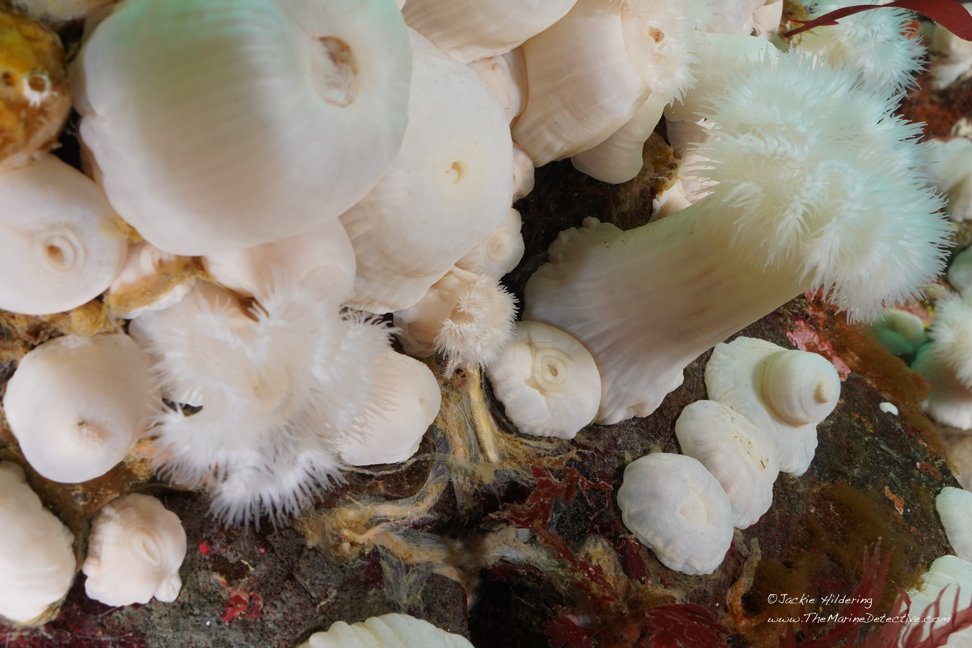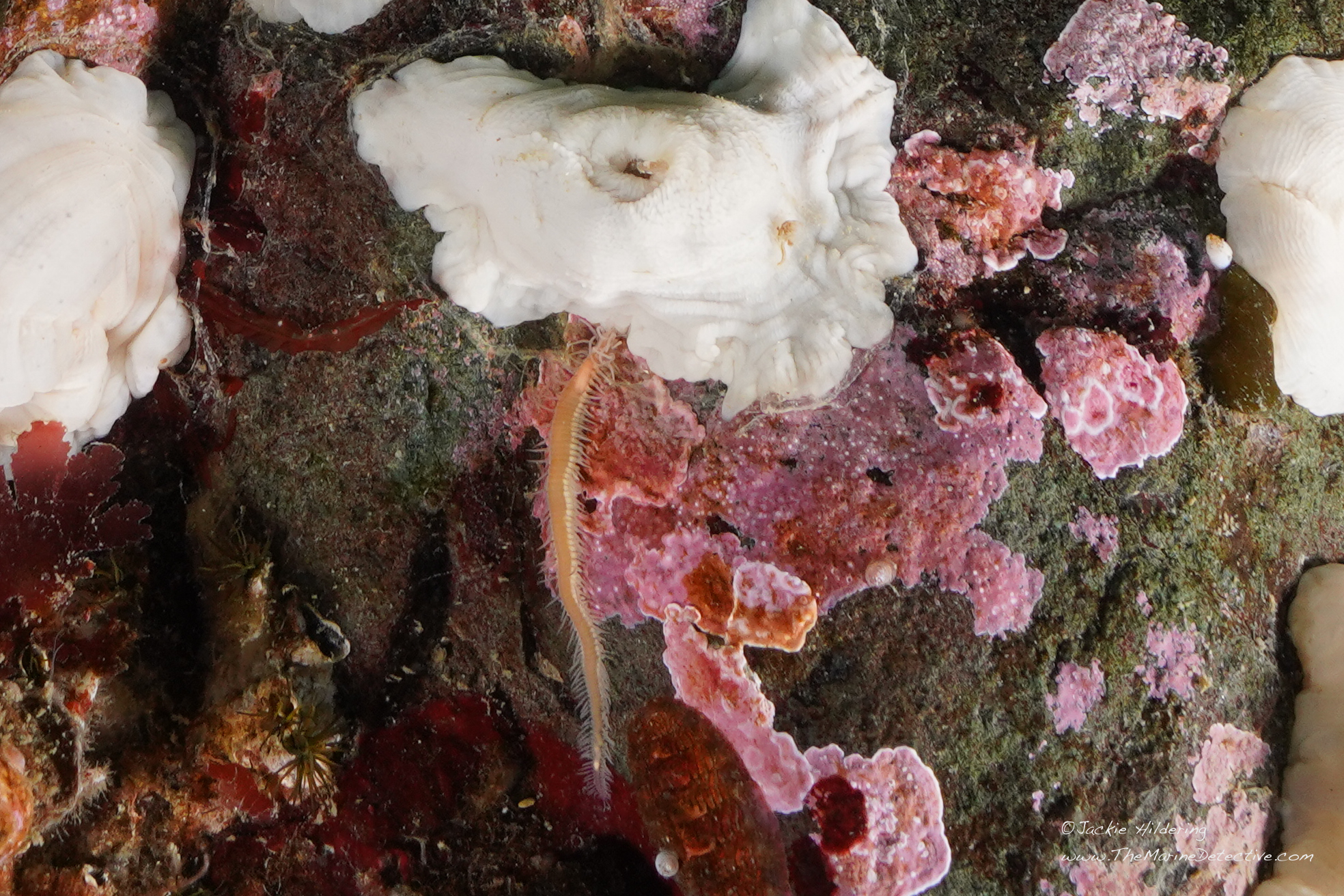 So TODAY’S mission was to return to this dive site and focus on the interaction between this species of necklace-worm and Short Plumose Anemones. How abundant are they? Are they biting the anemones?Are the worms anywhere other than around Short Plumose Anemones? Are the anemones using their acontia as a defense against the worms? Acontia are defensive strands filled with stinging cells (nematocysts) that are ejected when an anemone is irritated / threatened / stressed. The acontia can extend far beyond the anemone, providing longer distance defense than the stinging cells in an anemone’s tentacles.