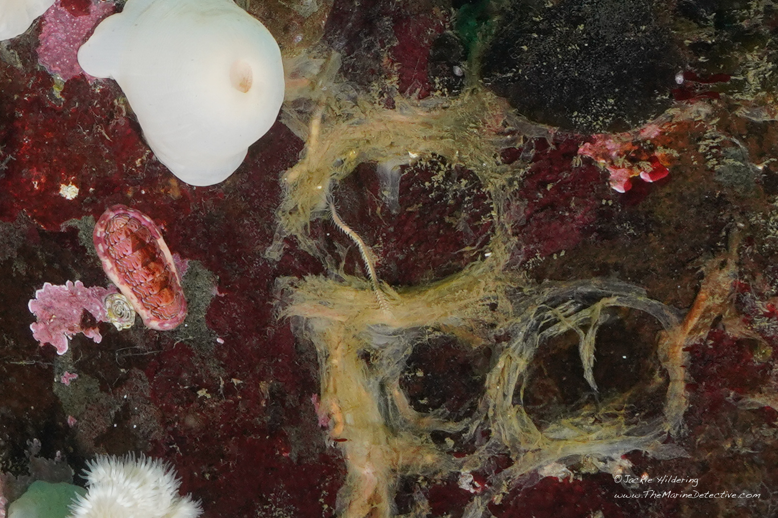 – I found the slime tubes almost everywhere there were Short Plumose Anemones at this site. I did not find them anywhere else i.e. this species of necklace-worm’s slime tubes were only around Short Plumose Anemones.