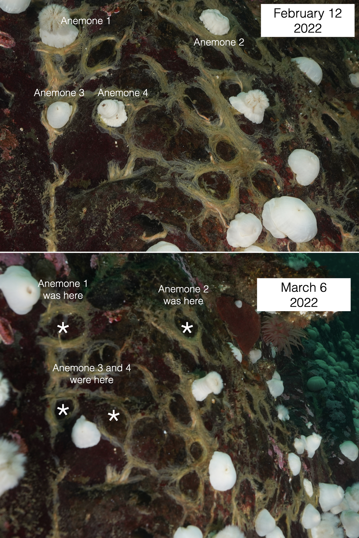 Below, you can contrast the same spot after 22 days. There has been a lot of change but again, I do not know how much the anemones would move around and/or dislodge in the absence of the worms. Oh no, is this now going to be my life? In addition to trying to document individual Humpback Wales and Tiger Rockfish, now I am going to try to document individual Short Plumose Anemones?! Probably.