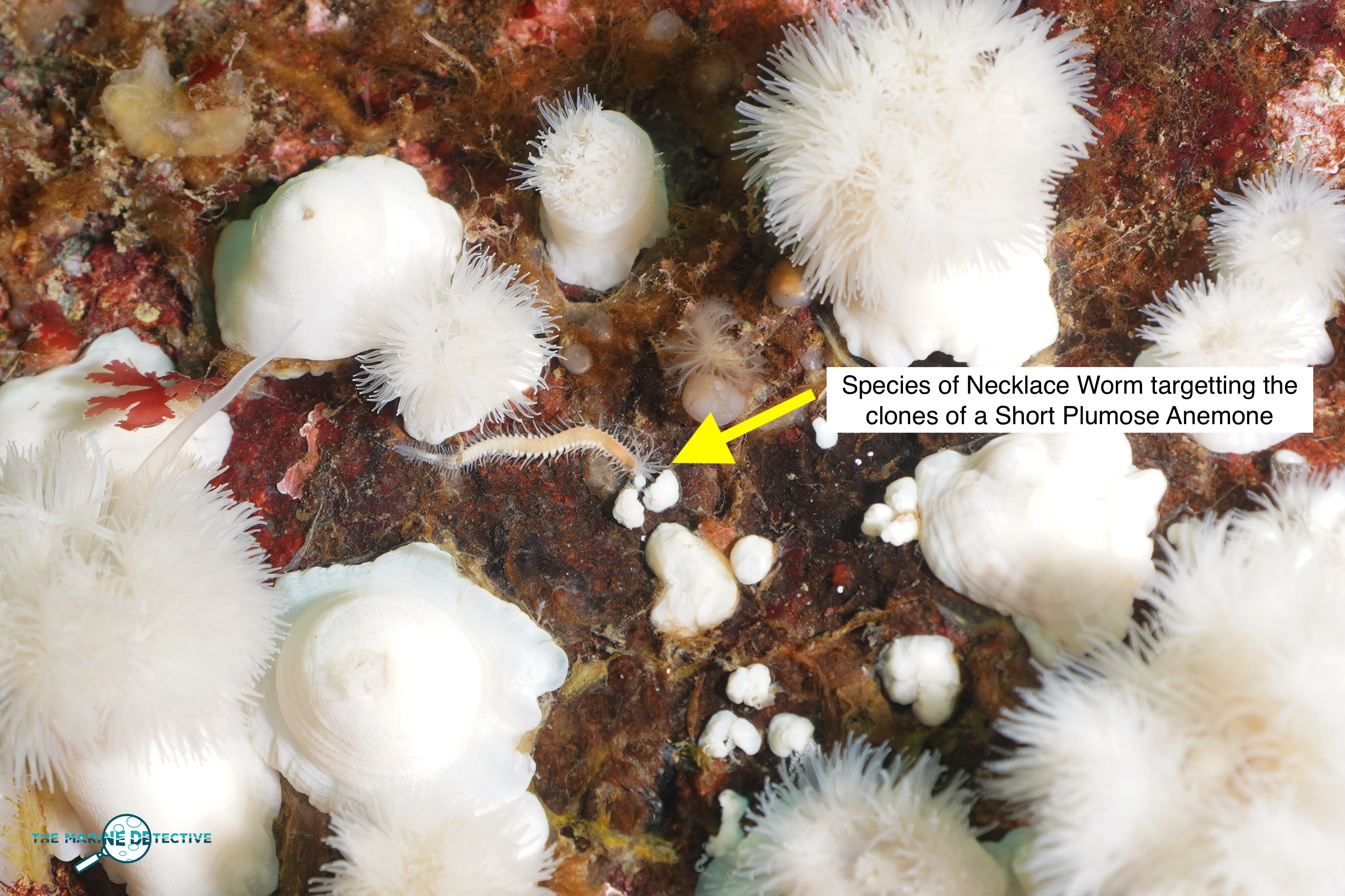 – YES I do believe this species of necklace-worm is biting into the Short Plumose Anemones. See below for abundant photos from today.