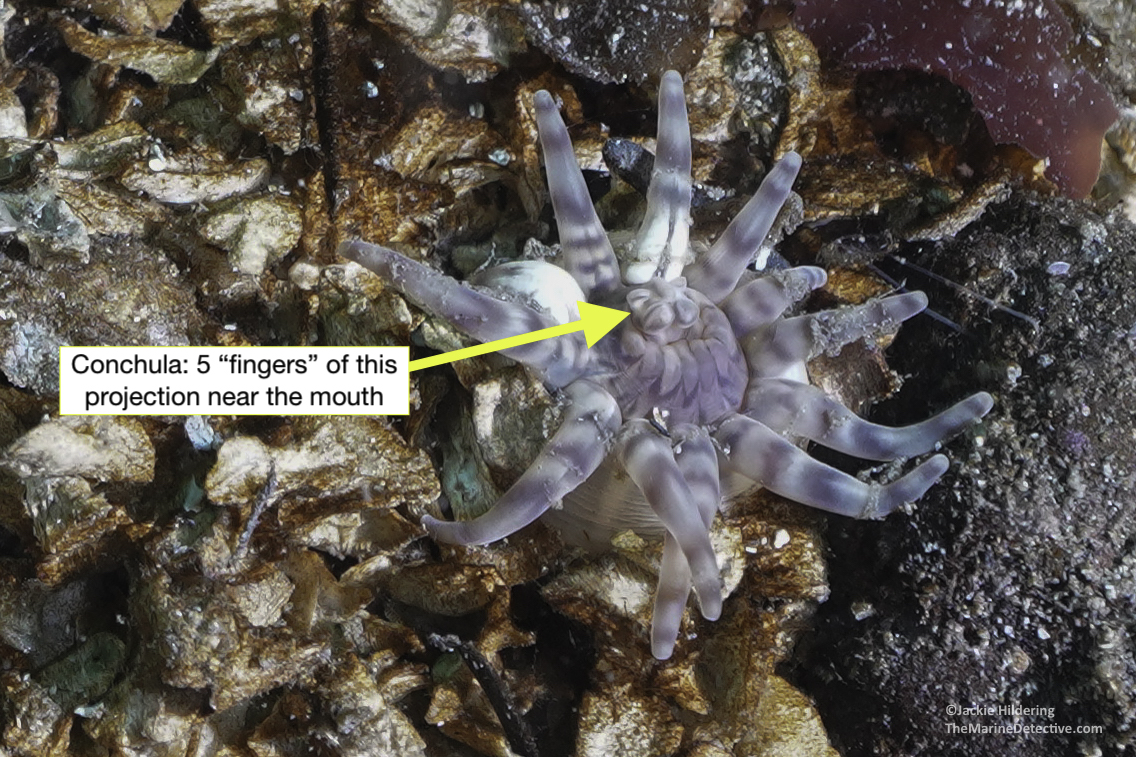 The taxonomy crowd might appreciate Peachia for a different stand-out feature, called the conchula: a projection near the mouth that functions in feeding, and is unique to this genus. In Peachia quinquecapitata, the conchula is divided into five distinct finger-like lobes, almost like a miniature hand. And I have to hand it to these mini moochers…they definitely get away with biting the hand that feeds them!”