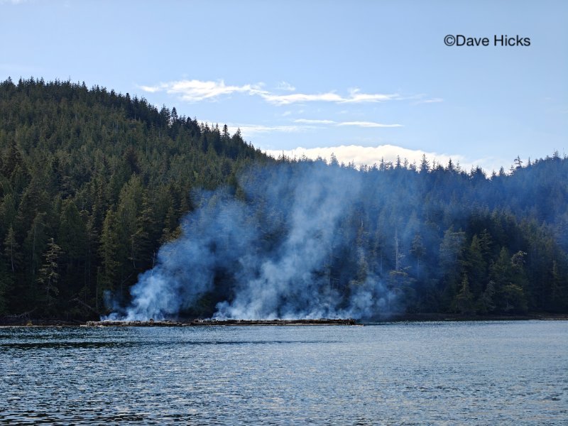 “At approximately 11:15am, our group of divers noticed smoke billowing out of Clam Cove, located on the north end of Browning Passage. We took the boat into the cove to check for danger and found The Hideaway, a scuba dive lodge, burning. We notified Coast Guard and stayed to monitor the flames to ensure the surrounding forest did not catch on fire. Once the flames receded and the majority of the floating structure had burned, we notified Coast Guard of the status of the fire and took our leave.”