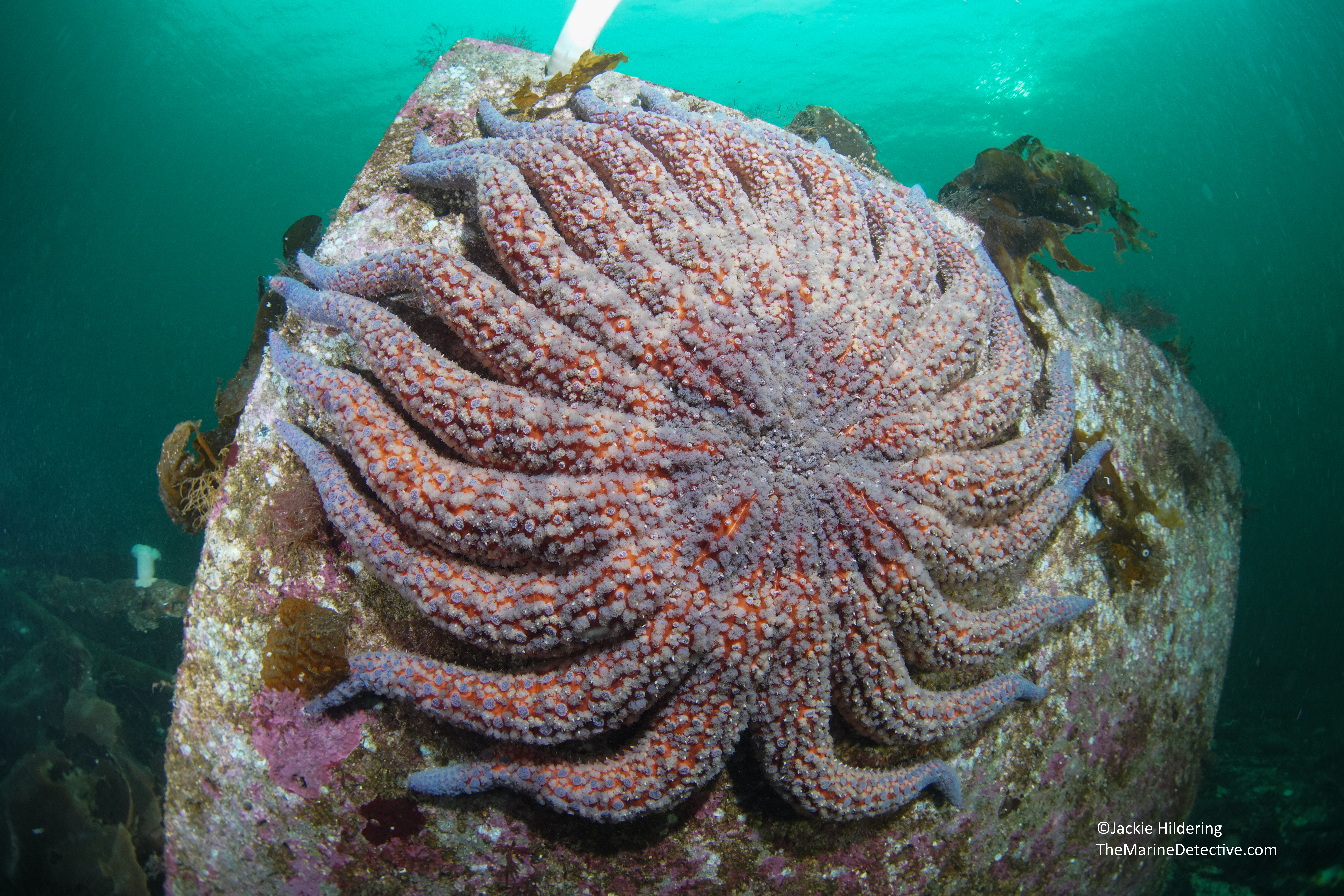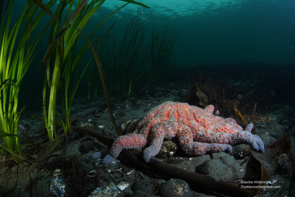 Sunflower Stars are the world’s largest sea star species at up to 1 metre across (Pycnopodia helianthoides). Before 2013, were you to look down from a dock in BC and Washington, you would likely see them . . . icons of our coast, common giants, and often what children would draw in seascapes.