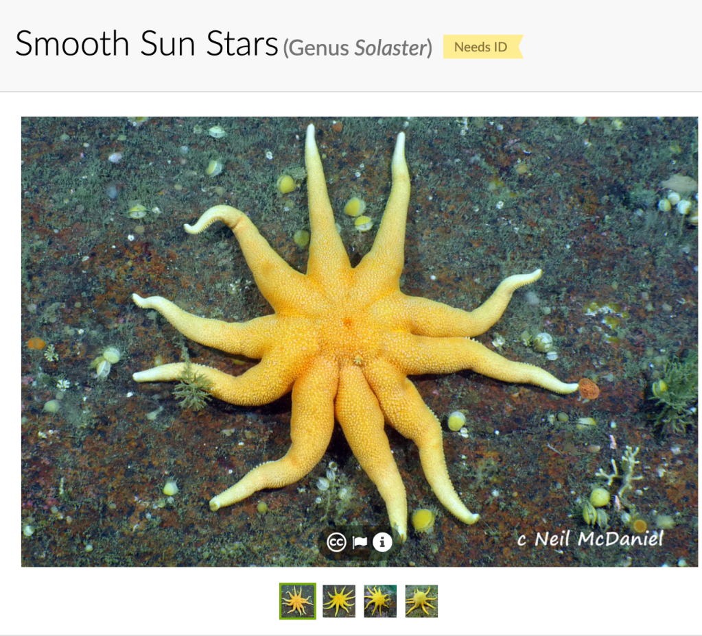 “I believe this is the undescribed species of Solaster found on our coast. In Lambert (2000), it is described as Solaster paxillatus, but my understanding is that is a NW Pacific (Japan) species, not NE Pacific . . . This Solaster usually has between 8 to 10 rays with a rather rough-looking aboral surface due to the conspicuous pseudopaxillae. Colour ranges from yellowish through a deeper orange. It is never bicoloured like stimpsoni [Striped Sun Star]. The rays can be fairly slim or quite puffy-looking. Unlikely to be confused with Solaster dawsoni [Morning Sun Star], which usually has more rays (12 is common), or Solaster endeca [Purple Sun Star], which has a similar number of rays, but much shorter and stouter”. (Neil McDaniel, pers.comm.)