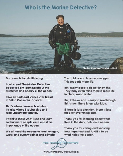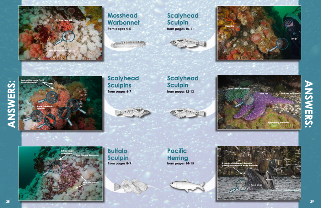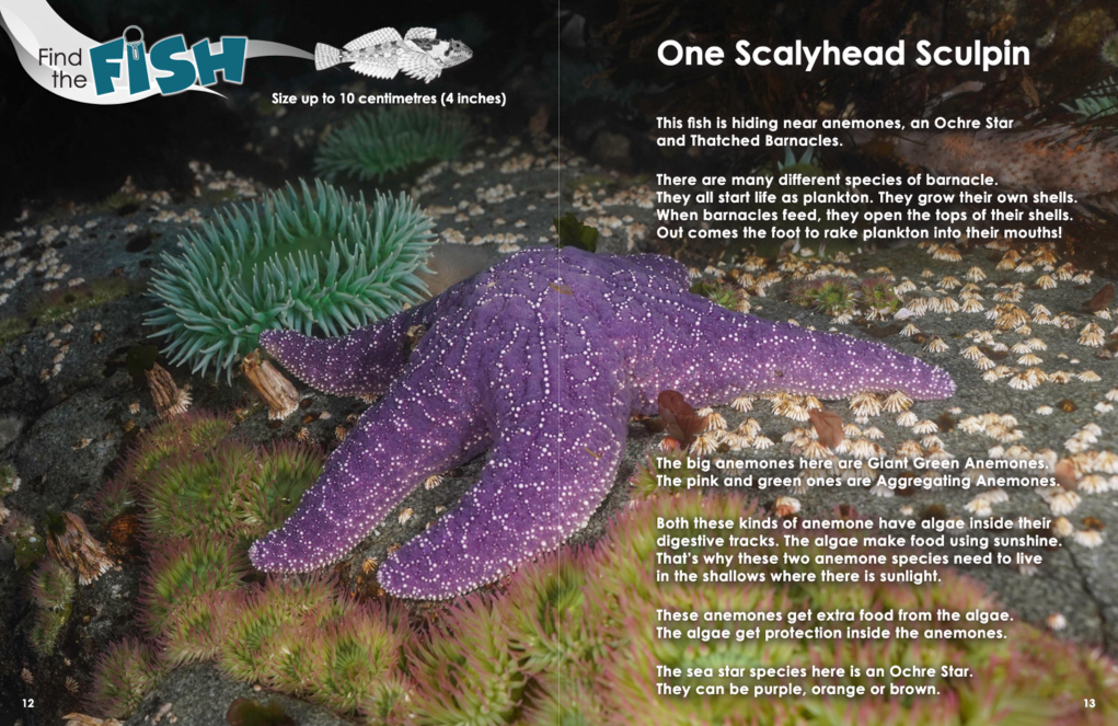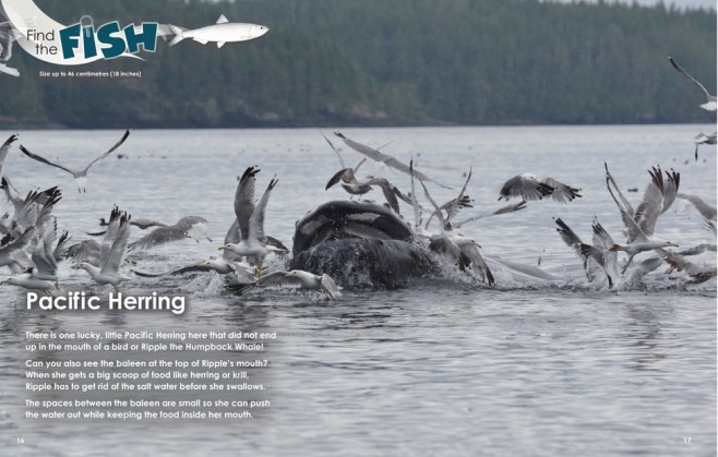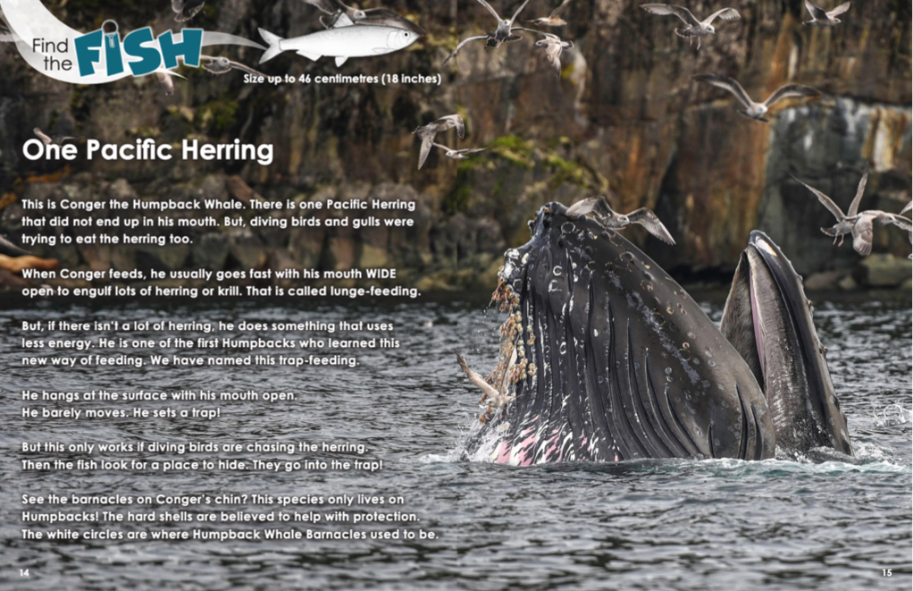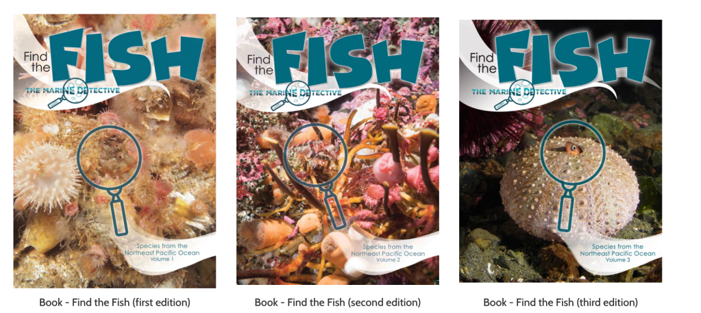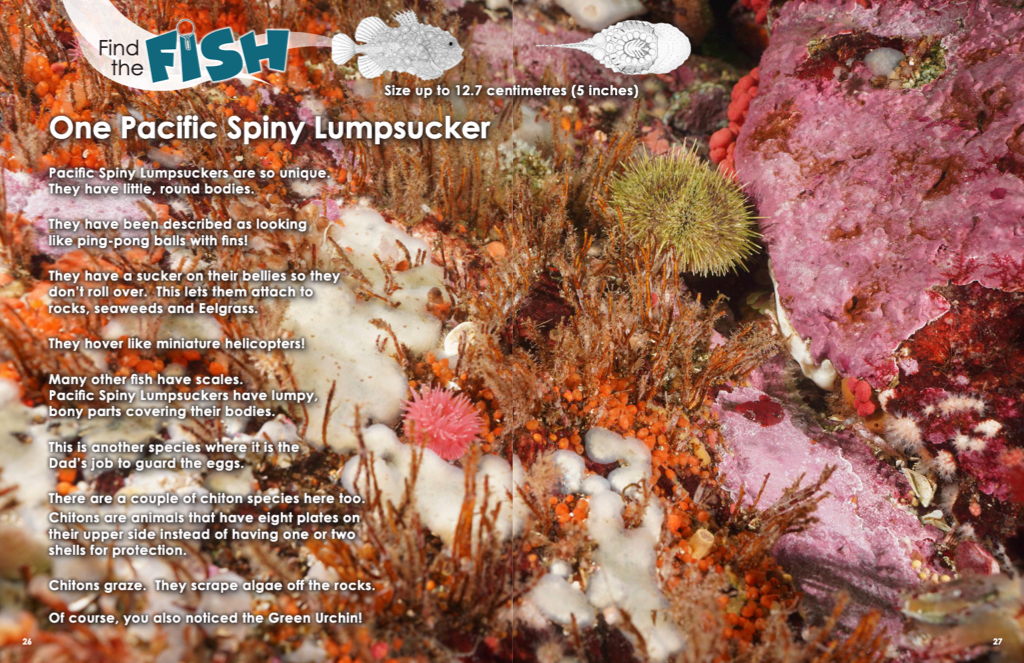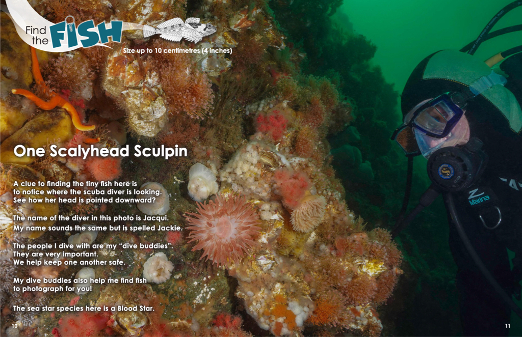 It gives me much joy that this third book in particular allows the facets of my life to come together – diving, photography, whale research and teaching. I dare say Find the Fish – Volume Three is the only children’s book that gives insight into the diversity of life off our coast while ALSO providing empowering scientific content about Sea Star Wasting Syndrome and our Marine Education & Research Society research into a new Humpback Whale feeding strategy.