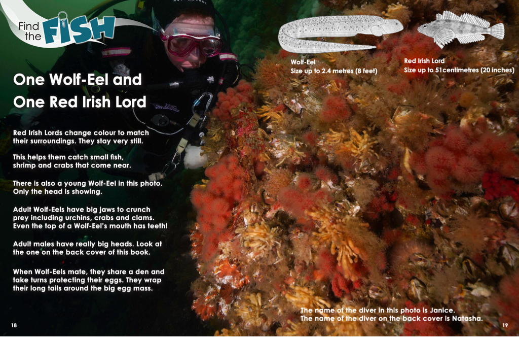 The books are the “Where’s Waldo” of the marine world. In addition to being fun, they are aimed and increasing knowledge about how diverse and colourful the life is in these cold, dark waters. The text provides information about the species in the images and invites children (and the adults who love them) to look for other species as well as the featured fish.