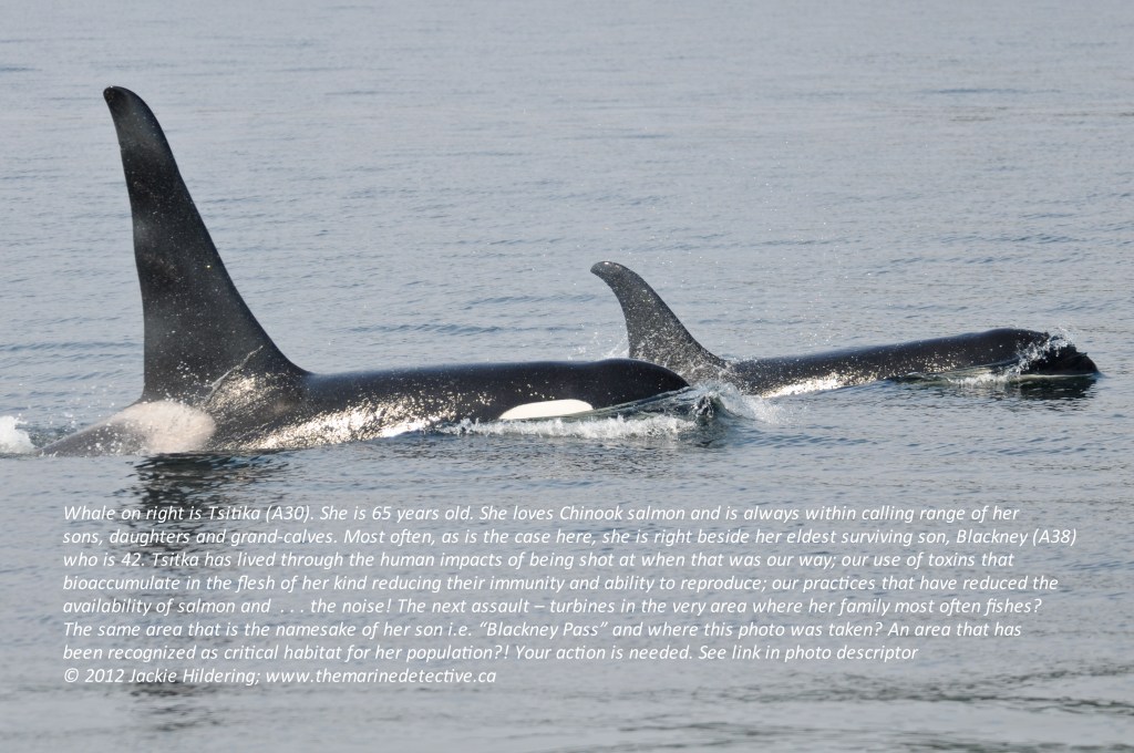 This posting on my FaceBook page has had success in creating further awareness. Feel free to share! Whale on right is Tsitika (A30). She is 65 years old. She loves Chinook salmon and is always within calling range of her sons, daughters and grand-calves. Most often, as is the case here, she is right beside her eldest surviving son, Blackney (A38) who is 42. Tsitka has lived through the human impacts of being shot at when that was our way; our use of toxins that bioaccumulate in the flesh of her kind reducing their immunity and ability to reproduce; our practices that have reduced the availability of salmon and . . . the noise! The next assault – turbines in the very area where her family most often fishes? The same area that is the namesake of her son i.e. “Blackney Pass” and where this photo was taken? The area that is designated as critical habitat for her population?