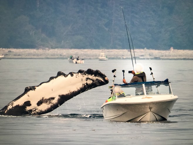 The two photos above of boaters taking photos with cell phones near an acrobatic Humpback Whale were taken near Campbell River. The photographer wishes to remain anonymous. These are older images where the previous photos are all from October, 2020. Here too the camera angle could influence how close this looks but again, this is NOT 100 m and it IS boater responsibility to know the