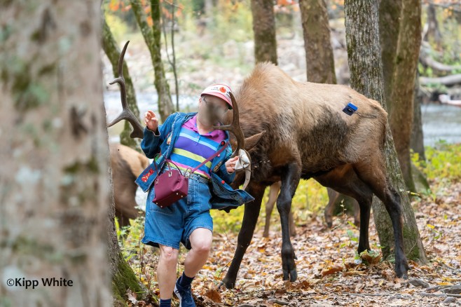 Kipp White. Backstory from Kipp: “The herd was resting in the woods behind the Visitors Center in Cherokee [North Carolina]. One of the cows got up and moved to the river. She started calling for the rest of them. Slowly the rest of the herd got up and started moving towards the water. I told everyone they should move back. They were between the herd and the water. No one listened. Then the bull started moving closer to the people and everyone was trying to get a good picture of him. Once again I warned the people saying “He has already charged at two people this morning, y’all might want to back up”. Then I said it one more time. Nobody listened. Next as you can see, he charged this lady. I talked to her afterwards and she said she was OK”