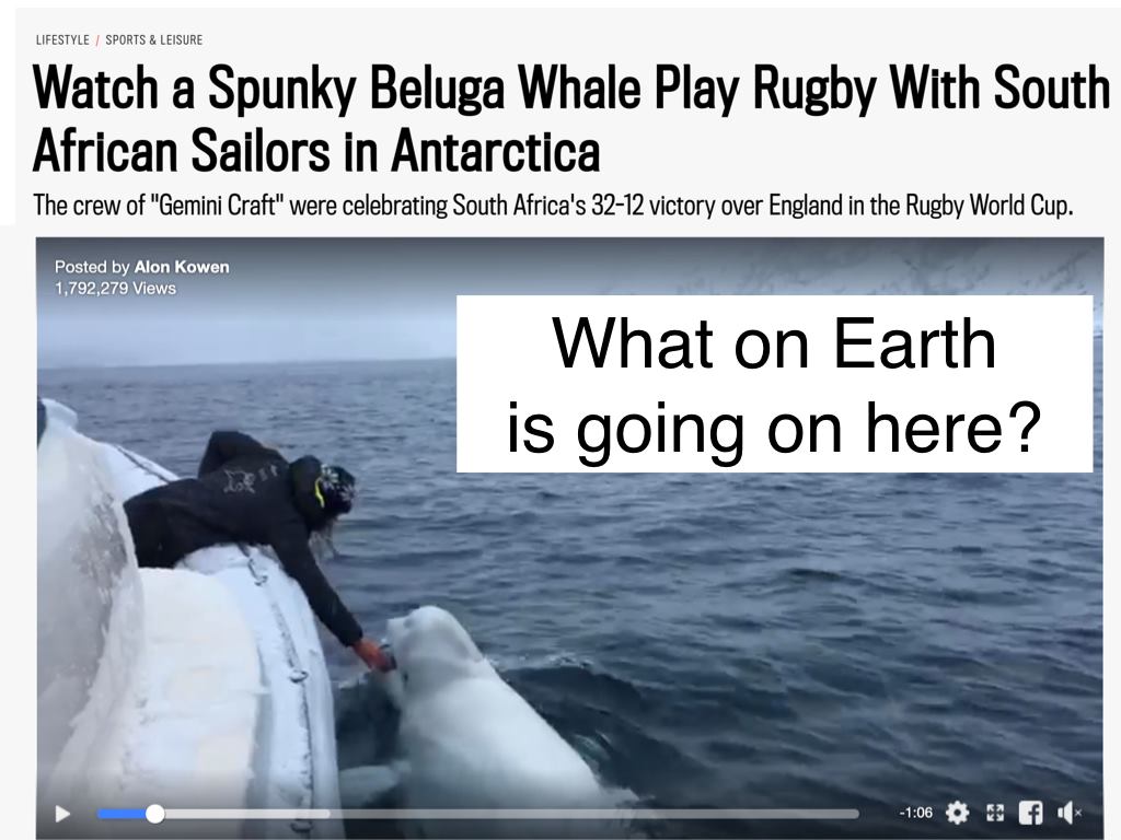 November 6th, someone used the video to associate it with South Africa winning the 2019 Rugby World Cup on November 2nd. He framed the video as being: “Beluga Whale celebrating the Springboks victory somewhere close to the South Pole! Spot the Cape Town build Gemini Craft and the South African accents.” The accents and jargon of the people on the boat are indeed South African, the brand of the boat is South African and the ball is indeed a 2019 official Rugby World Cup ball. But, this was NOT filmed near the South Pole.