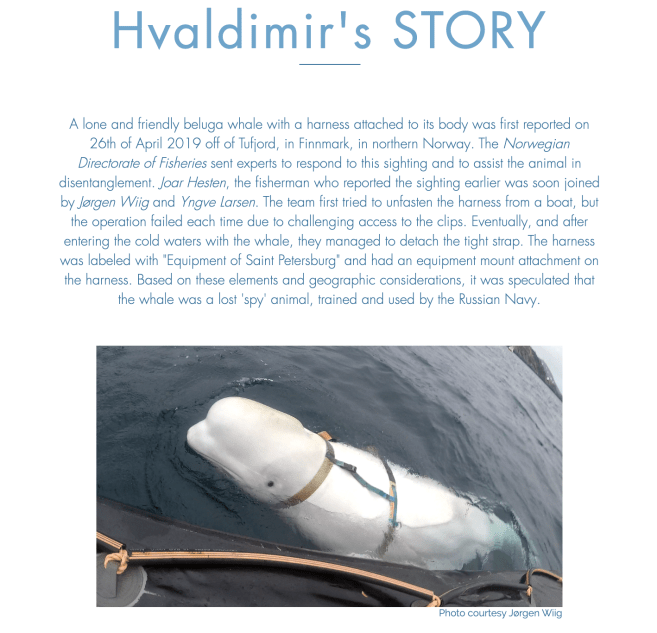 The whale is “Hvaldimir” the Beluga found off northern Norway in April of 2019 with a harness marked “Equipment of St. Petersburg” (as confirmed by the Hvaldimir Foundation). This whale has been referenced as “the Russian spy whale”. Likely Hvaldimir’s training would have included being rewarded with food when retrieving objects. The nickname Hvaldimir is a word play on the Norwegian word for whale, “hval,” and Russian President Vladimir Putin’s first name.