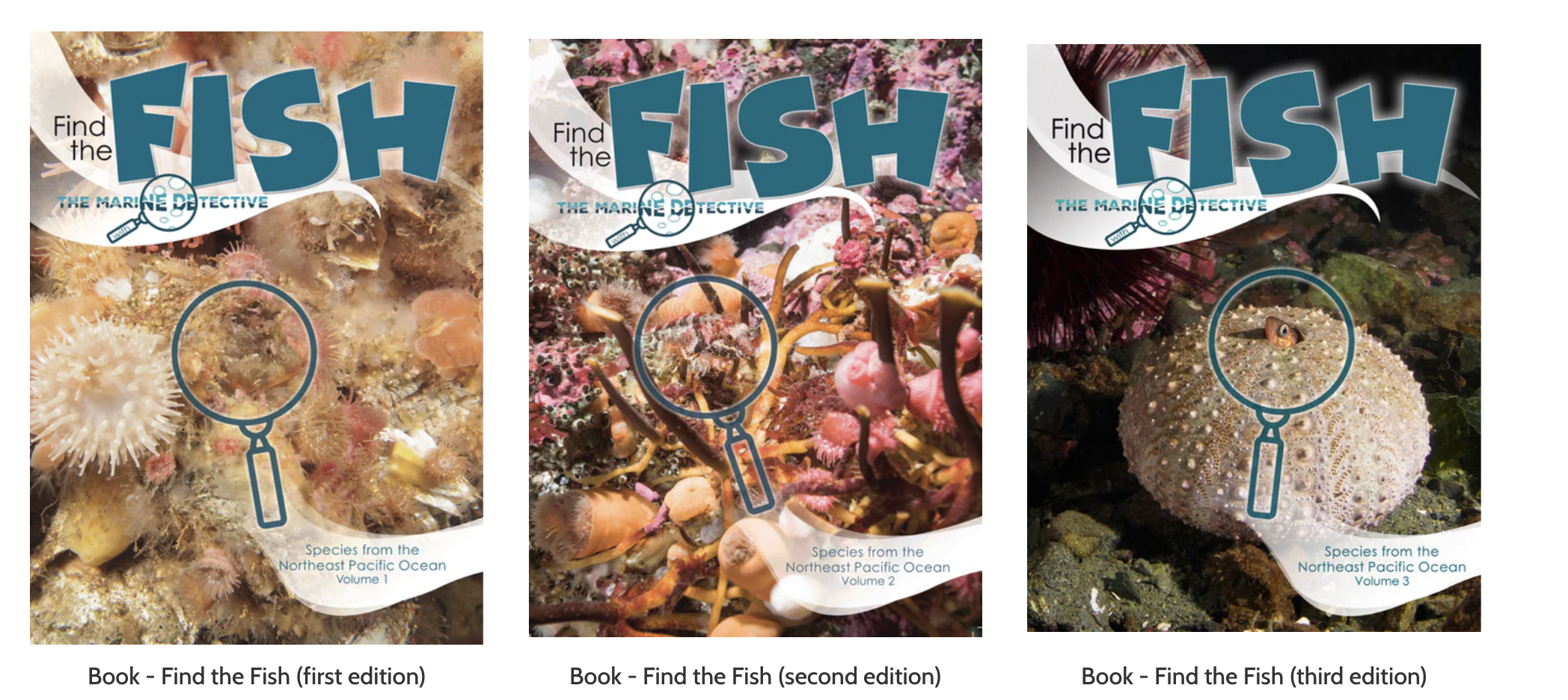 The trifecta! The books are soft-cover and answer pages are included showing the locations of the fish. The books are self-published as Marine Matters Publishing.