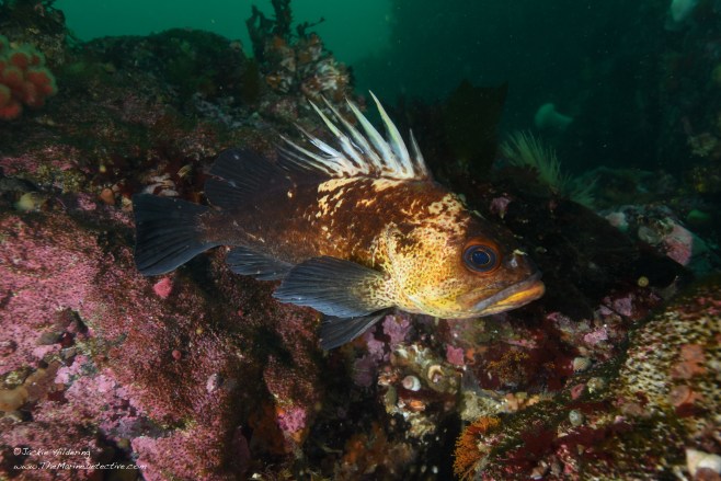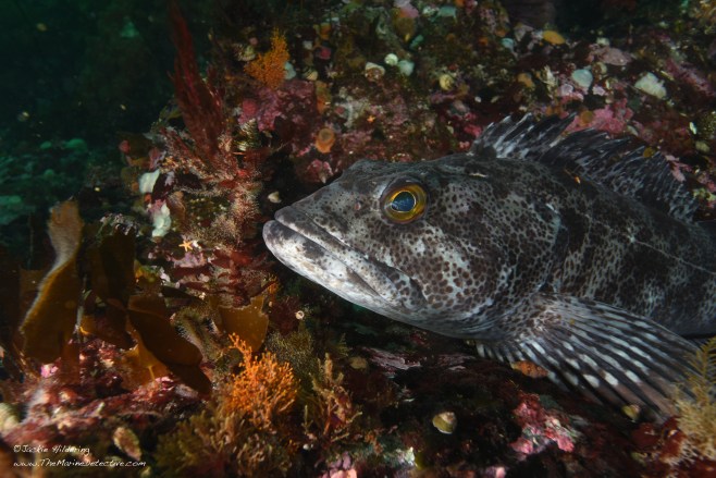 Photo above is another perspective on the same fish. Note that the bright orange life you see here are animals, not plants. They are Orange Hydroids. The soft coral beside the Kelp Greenling’s head is Red Soft Coral.
