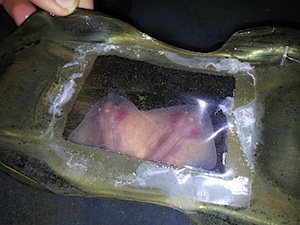 Two Big Skate embryos developing inside an egg case. A “window” has been cut into the egg case to allow development to be observed. Photo Kelcie Chiquillo.