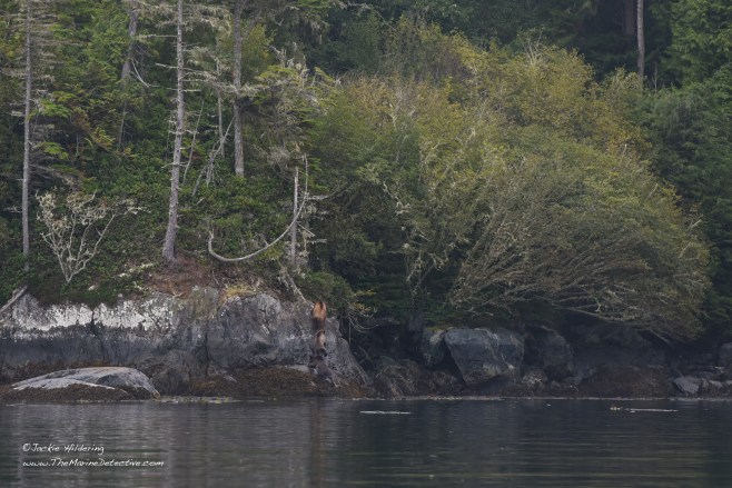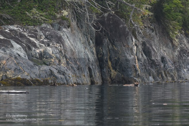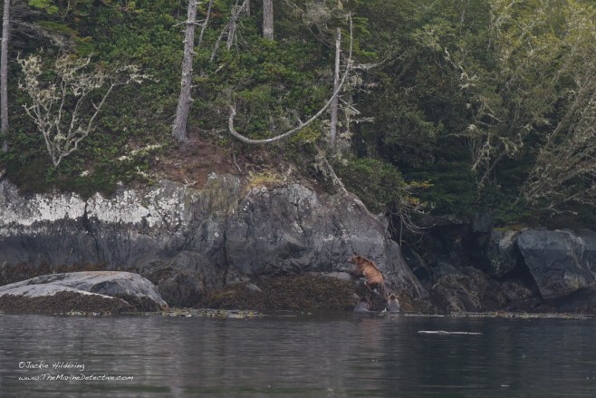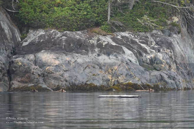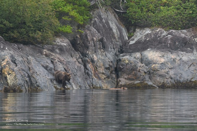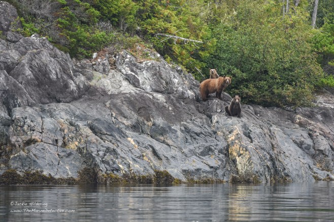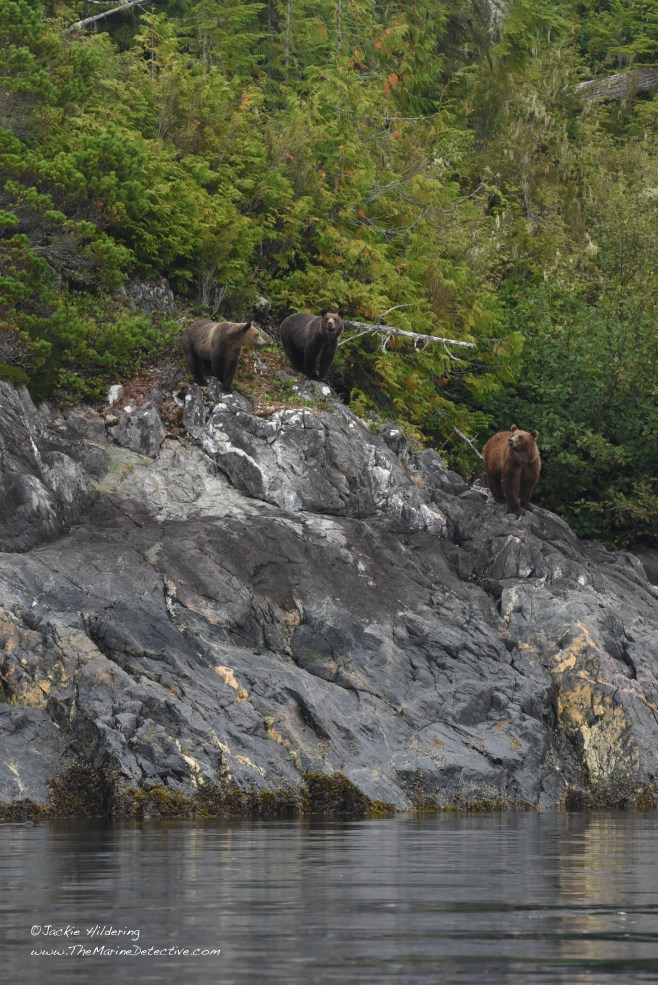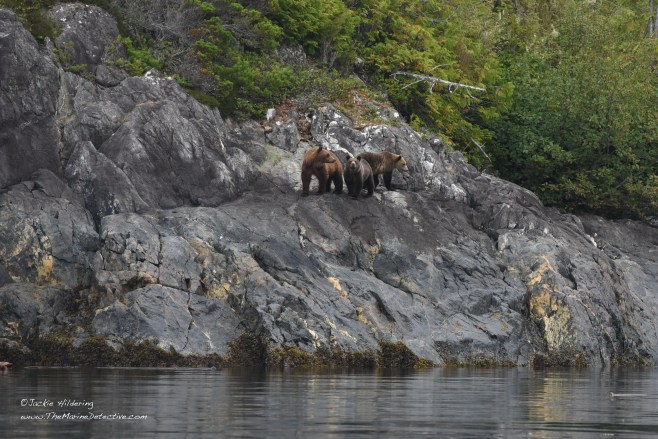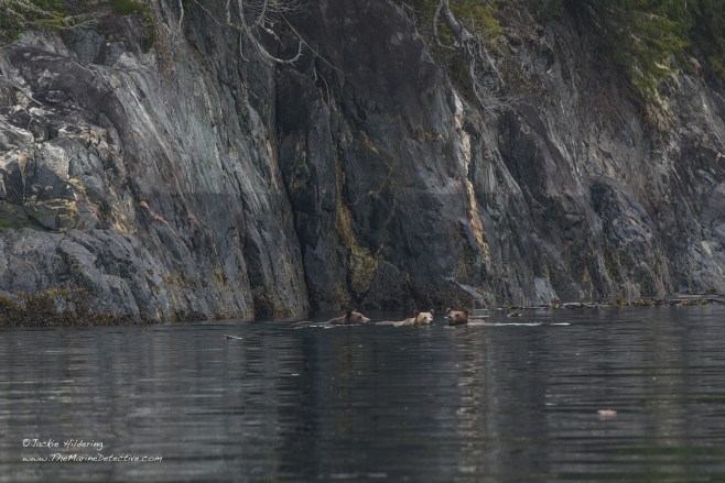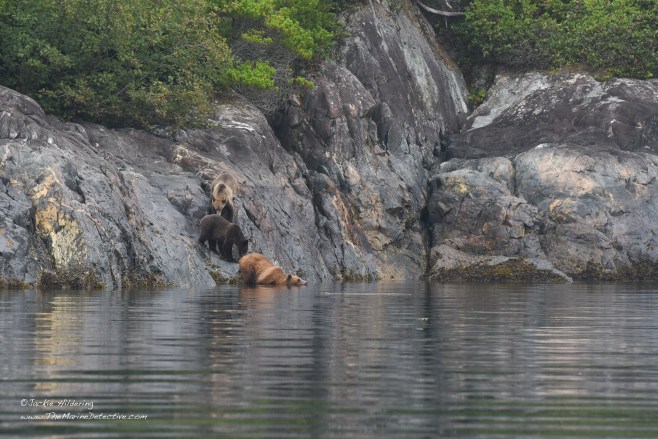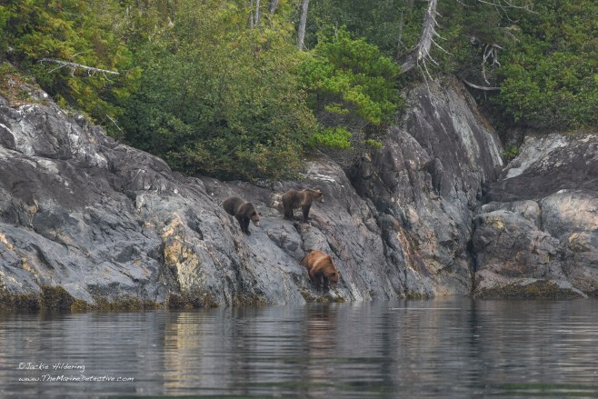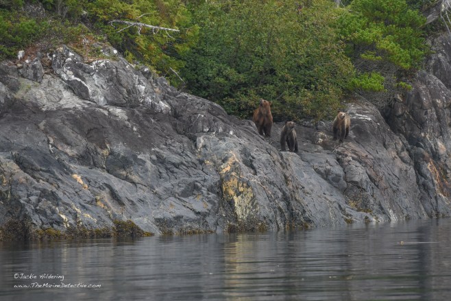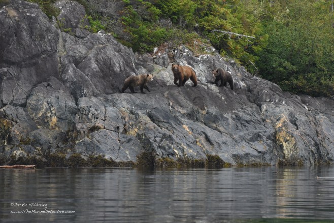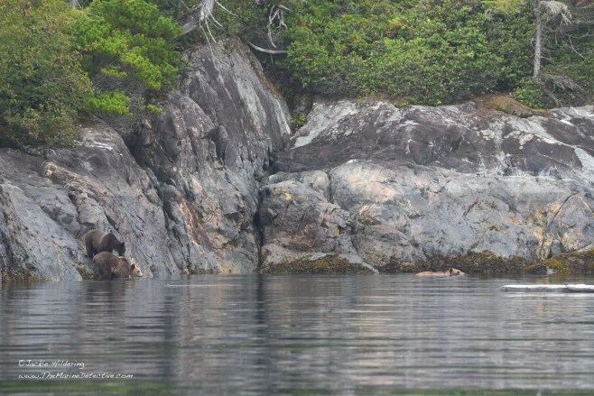 Yesterday, while sampling fish in a little bay, we realized a Grizzly Bear mom and her two cubs had emerged from the forest. The trio sat and listened to the blows of Humpbacks resounding off the rocks, and also raised their heads alert to the exhalations of Steller Sea Lions going by. After sniffing and listening possibly to judge safety, mother bear determined they were to swim to the other side of the bay. The cubs appeared trepidatious. Mother swam back to escort them. Then, after back on land, and having shaken off the ocean water from their fur, they were again absorbed by the forest.