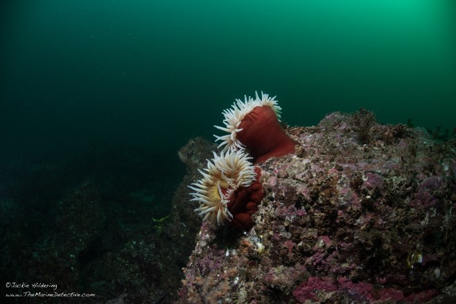 I got lost for a little while in trying to capture the beauty of this giant and their environment – Black Rockfish swimming above, the pink crusts of coralline algae, Orange Cup Corals, a hermit crab, Wrinkled Amphissa snails.