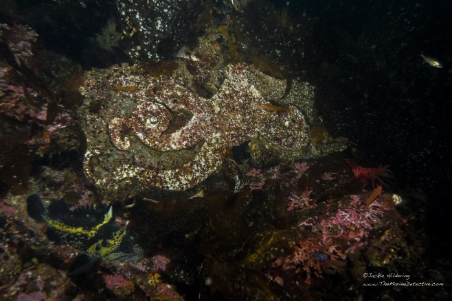 They are of course easier to see if on the move. When a Giant Pacific Octopus is hunting, there sometimes is an entourage of rockfish too, hoping to benefit when the octopus flushes out the other fish and shrimp from between rocks.