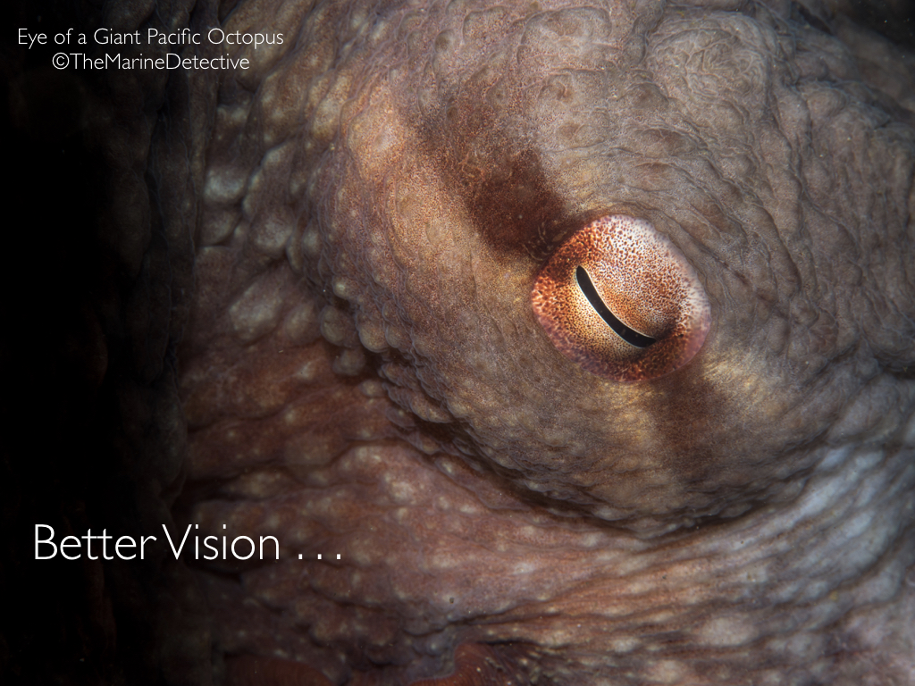Giant Pacific Octopus eye with the pupil constricted due to my light. I took the photo with a zoom lens when this octopus was in her den.
