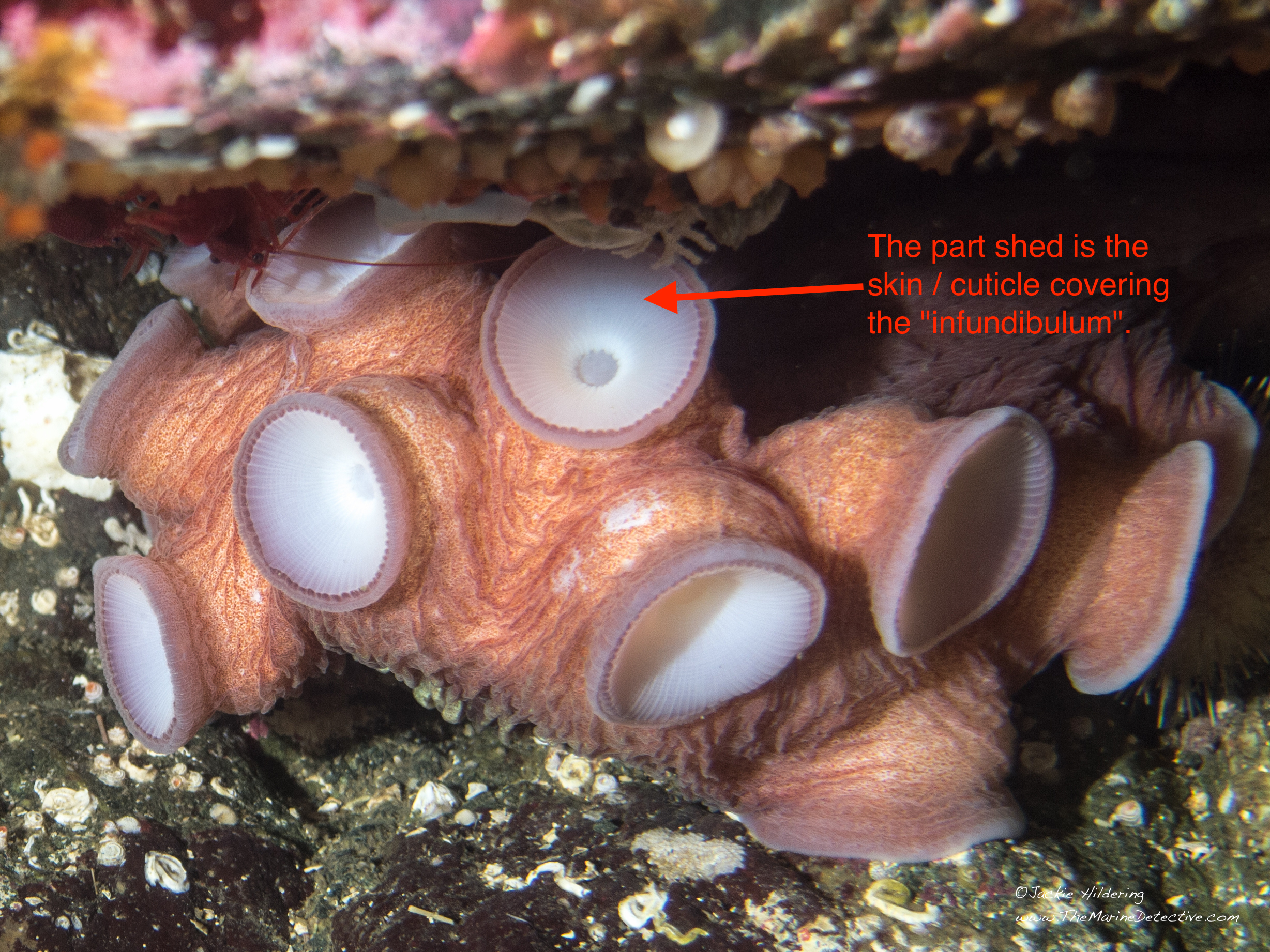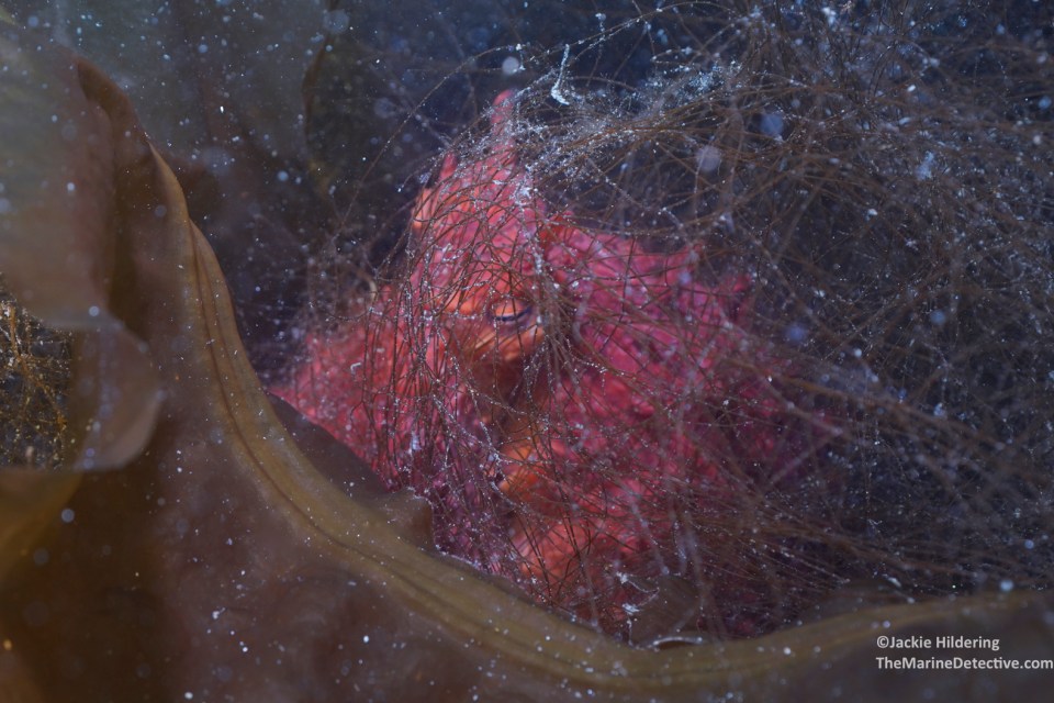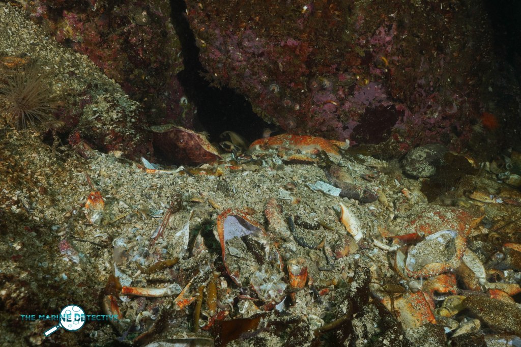 And the Giant Pacific Octopus who lives in this den has clearly been eating a lot of Red Rock Crab.